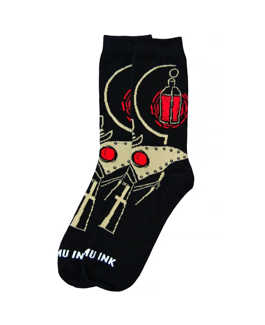 These Akumu Ink socks are comfortable knitted mid-calf socks. The hand-drawn artwork is named Plague Seeker, depicting an ever-devoted physician, obsessed with disease, trudging through illness to seek out plagues.