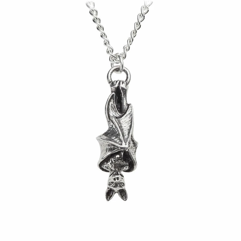 A roosting bat suspended upside-down, in cast and antiqued pewter.