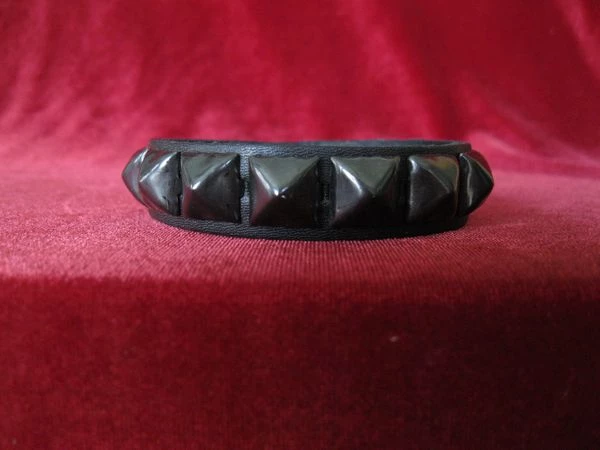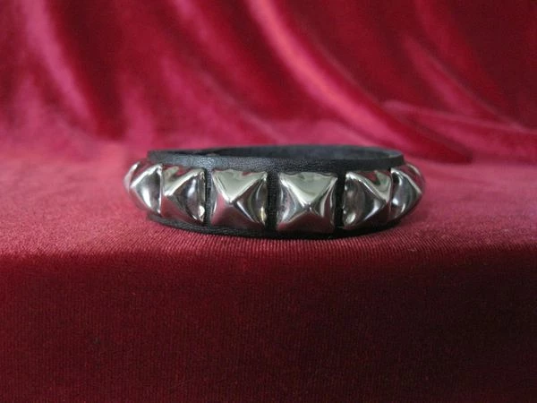Single row pyramid wristband on black leather with bright nickel 1/2″ pyramids by Ape Leather. Choose from black or silver.