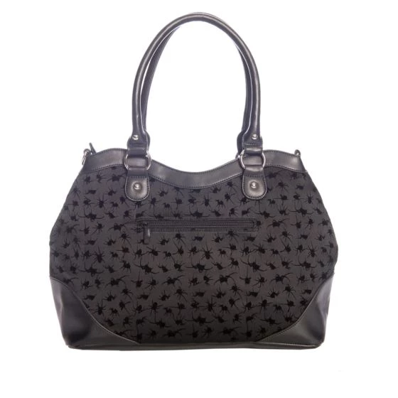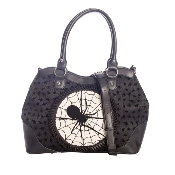 Black handbag featuring spiders in a flocking print and a spider in its web cameo.