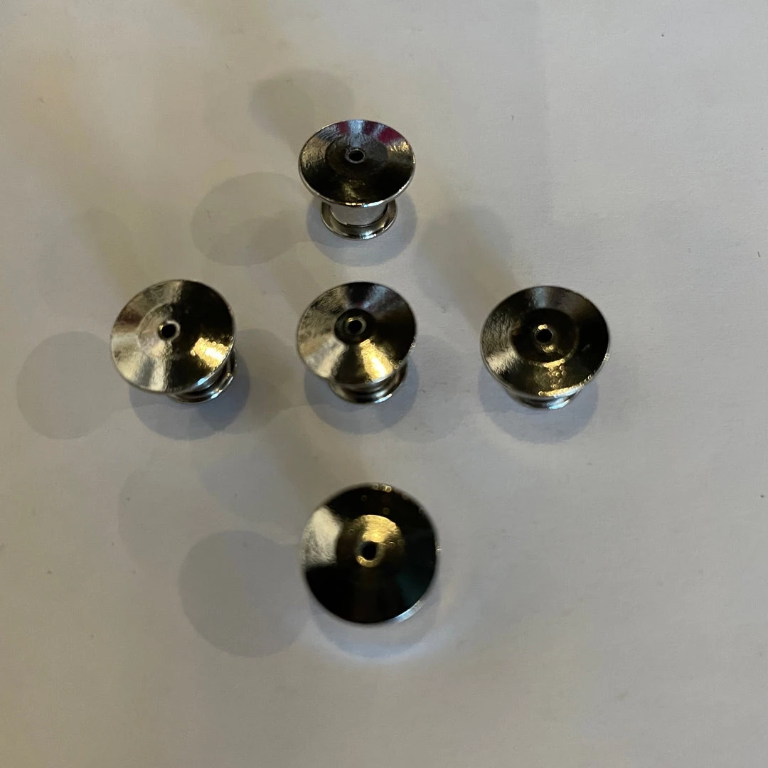 5-pack of locking metal pin backs for enamel pins or pin badges. Fits a standard 1-1.2mm post.