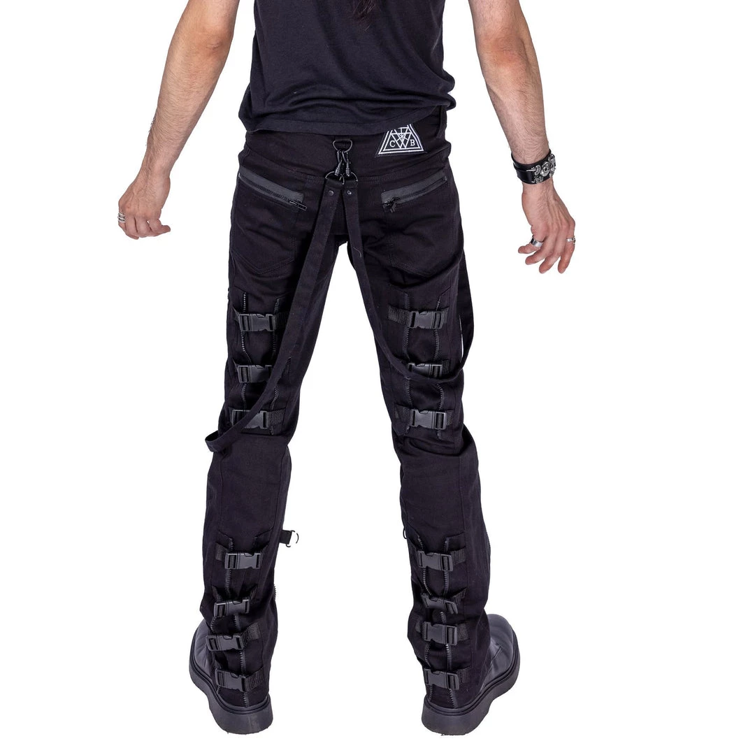 The Diego Pants by Chemical Black are slim fit pants with black straps, zipper accents, and clips on the back of the legs and detachable straps.