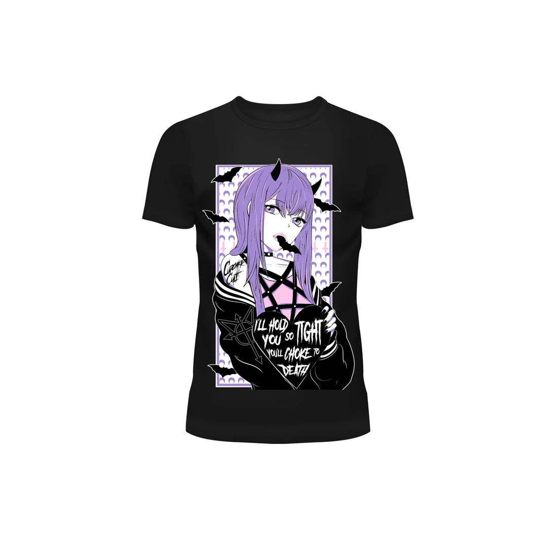 This cute manga-inspired design features a devil with bats flying from her mouth with the text “I’ll hold you so tight you’ll choke to death!”