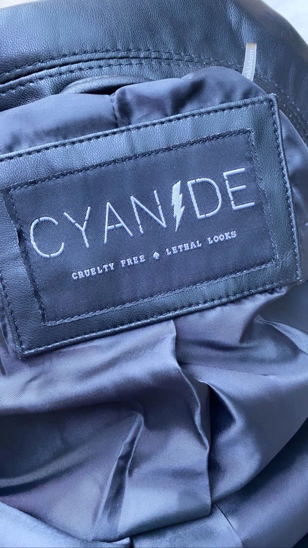 This bad ass vegan leather motorcycle inspired jacket has all the bells & whistles! Featuring a high quality outer PU fabric, fully lined (in black of course), with double inside pockets, perfect for storing your phone, keys, etc at gigs, or while riding. All snaps are functional, and it also has 3 outer zipper pockets, plus a small snap pocket on the front. All the details on this jacket make it a staple that you will never want to take off!Â