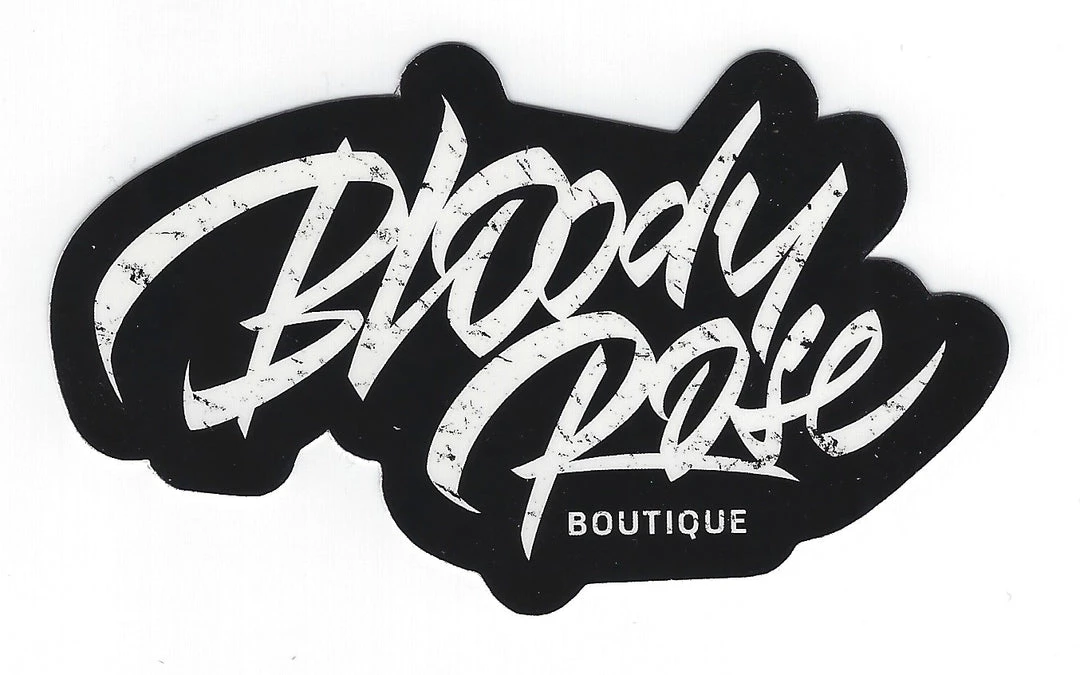 The Bloody Rose Boutique distressed logo in black and white on a die cut vinyl sticker. Silkscreen printed on thick, durable vinyl to protect the sticker from scratching, rain & sunlight.
