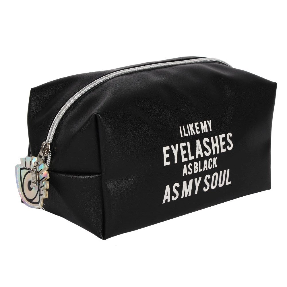 Matte black makeup bag featuring the words ‘I like my eyelashes as black as my soul’.