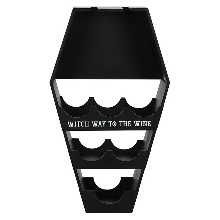 This coffin shaped wine shelf is sure to delight guests at your next spooky event. Includes slots for four wine glasses and six bottles with ‘Witch way to the wine’ text.