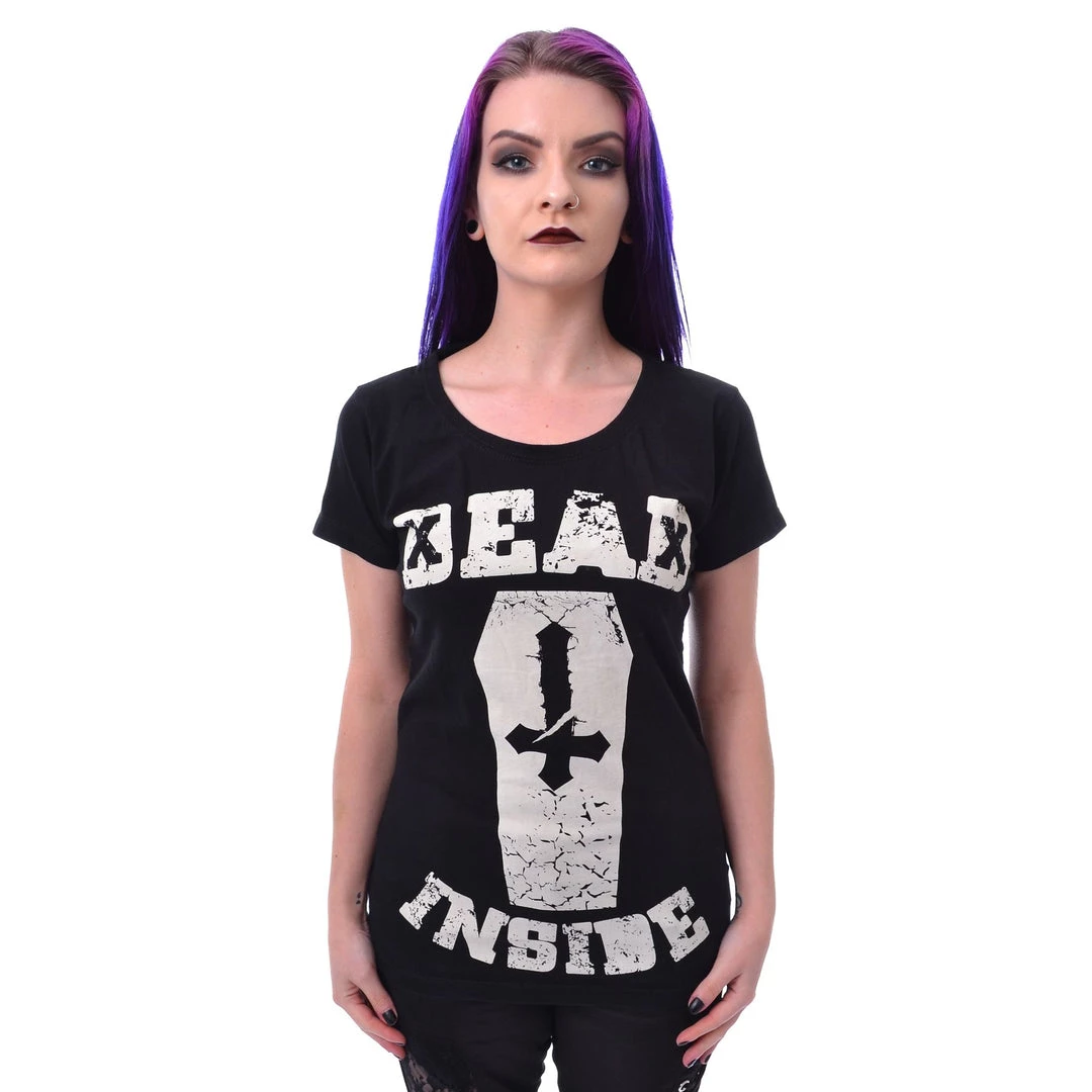 Dead Inside fitted women’s fitted t-shirt featuring a coffin and upside-down cross discharge ink graphic.