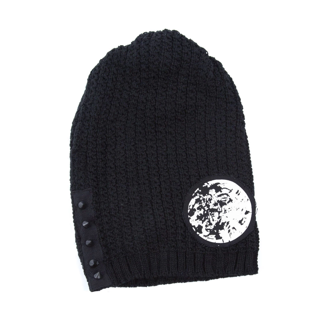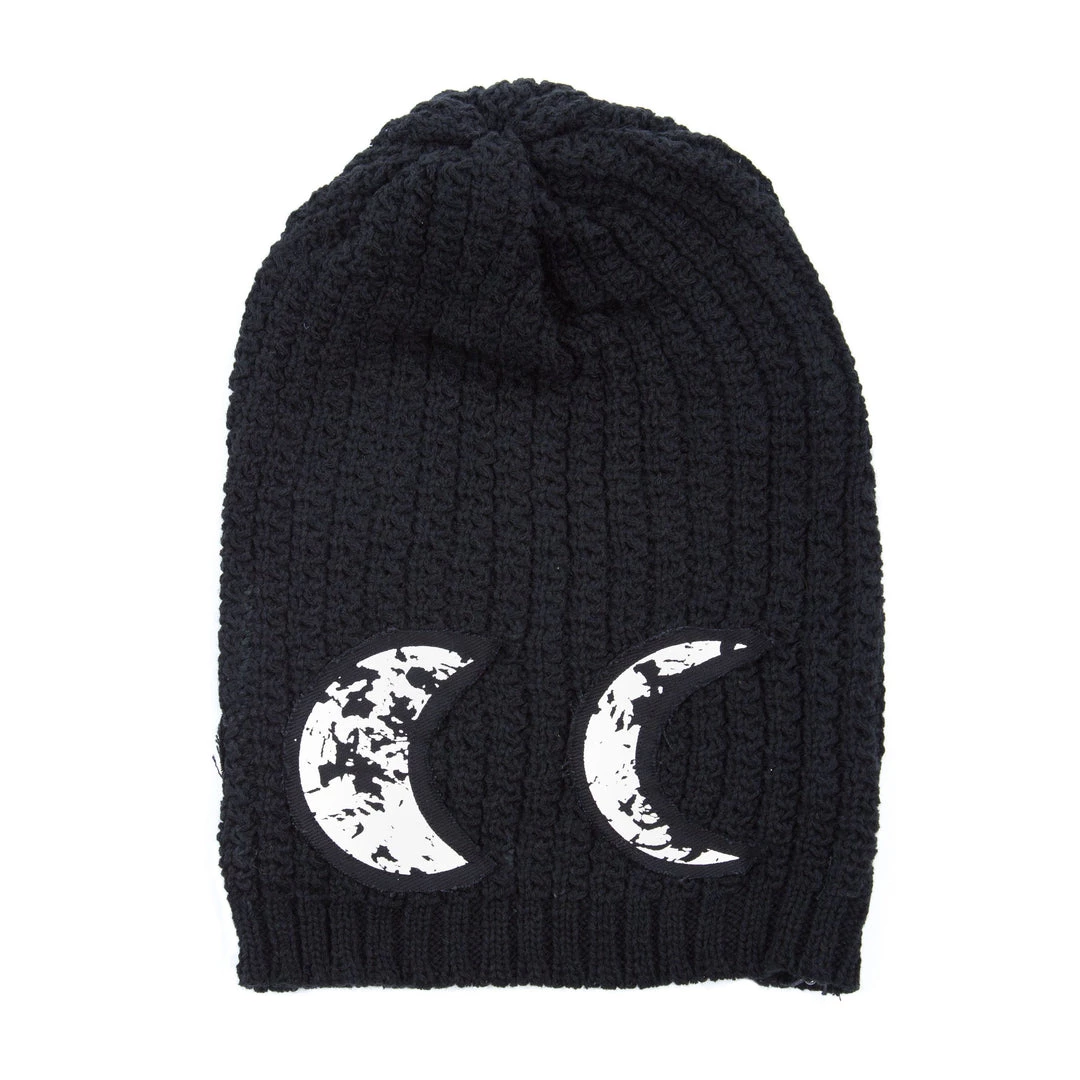 Moonchild hat by Heartless. Black knit hat with black cone studs and moon phases stitched to the hat.