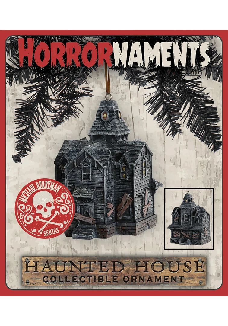 The Horrornaments sculpted haunted house Halloween-themed tree ornament. Designed by Michael Berryman, cult classic actor known for The Hills Have Eyes, Weird Science, The Devil’s Rejects and hundreds more.