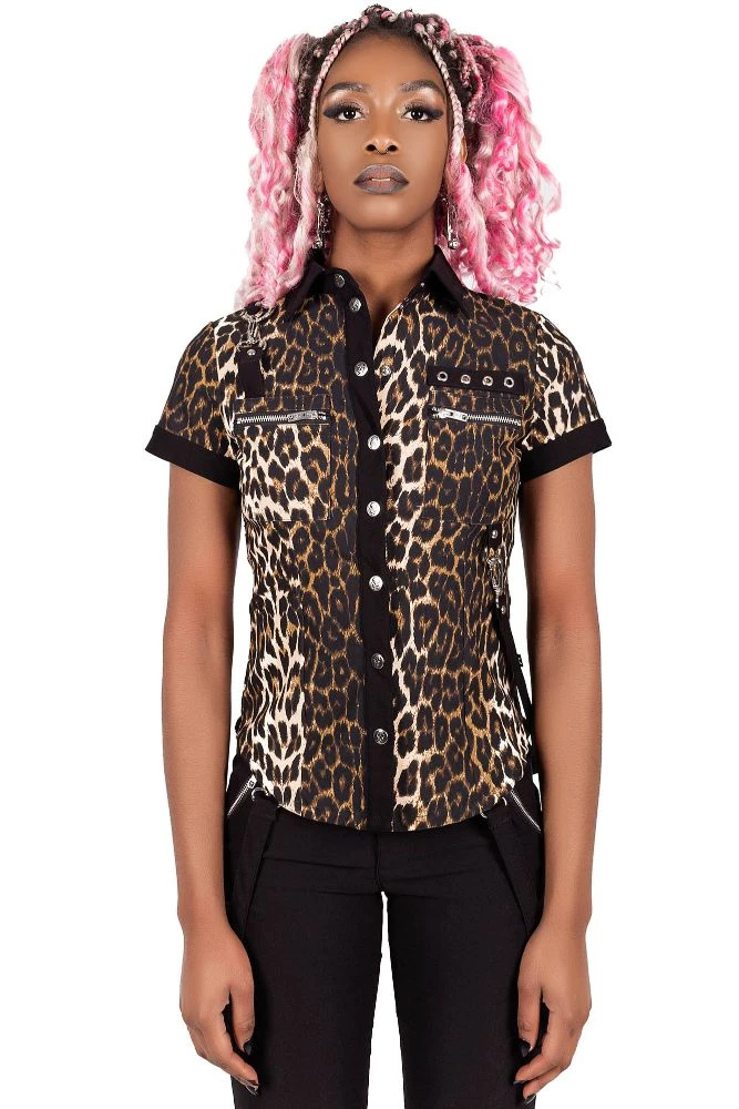 Show your wild side in the ‘Cat’s Meow’ shirt. The perfect combination of darkness and decadence – conjured using a luxe woven fabric which stretches to perfection for a deadly fit! Finished in leopard print, with detachable strap, button front and contrasting details. This statement-piece is the perfect addition to any dark wardrobe – looks killer dressed up or down!