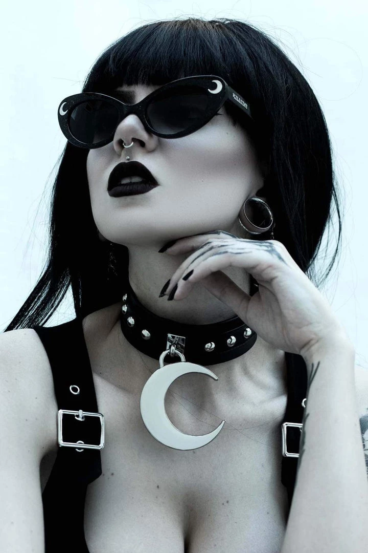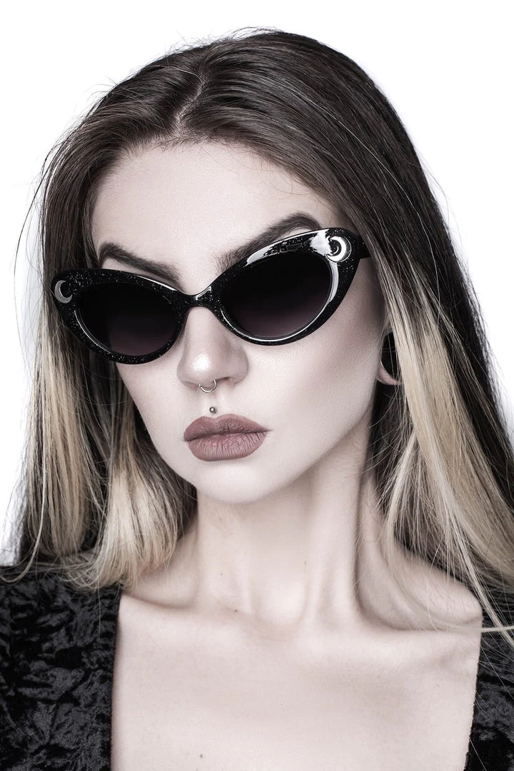 Add a touch of grunge; the ‘Cosmic Shade’ sunglasses are channeling some babe vibes whilst keeping it dark – seriously oversized and with clean slick lines. Black custom frames + dark tinted lenses and silver hardware detail of crescent moons. UV protection.