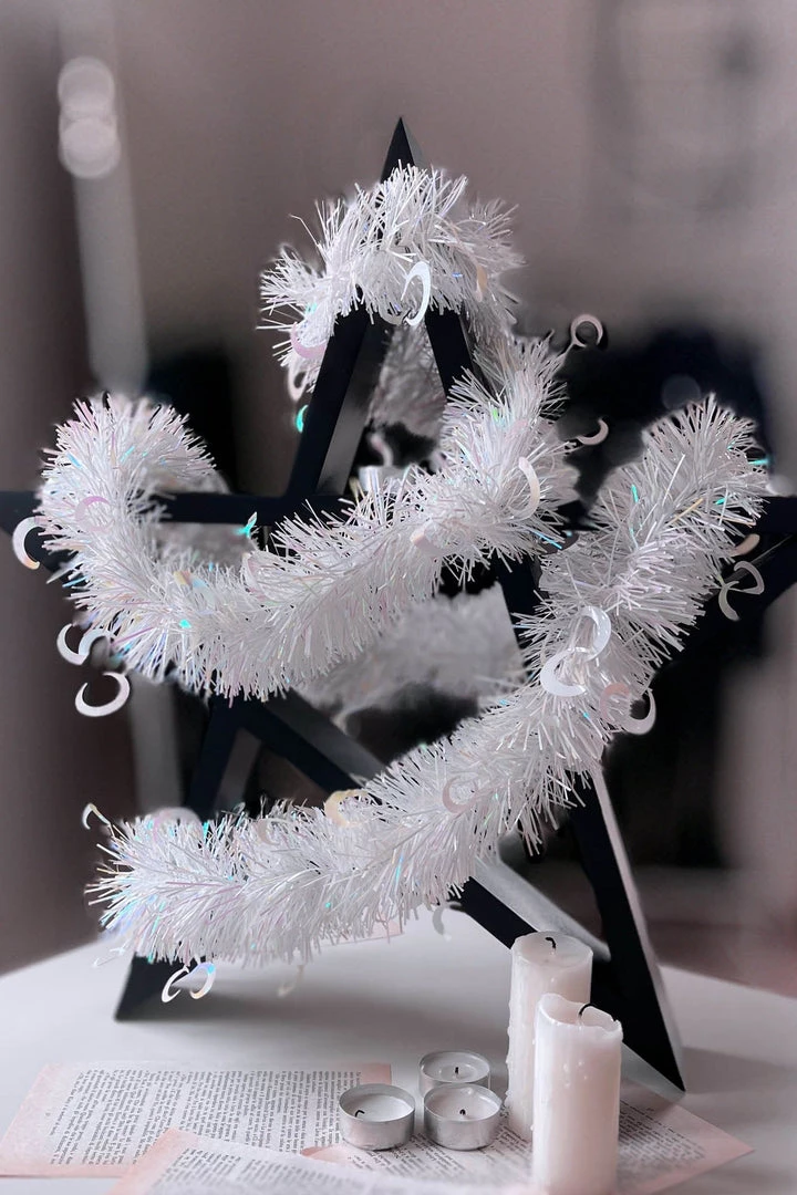 Get into the festive spirit with our new ‘Luna’ hexmas tinsel, large size with crescent moon decorations and all-white finish. Perfect for adding your special touches to the holidays.