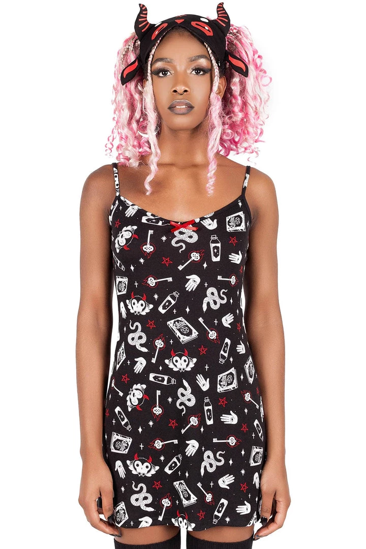 Get down and cozy with the ‘See U In Hell’ sleep dress; featuring a fitted body with lace trims in a super-soft fabric with just the right amount of stretch – for perfect comfort and fit! Statement contrasting print all over, thin straps and easy to wear from dusk to dawn.
