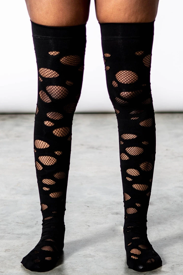 When all else fails, get new socks! Classic and exxxtra long socks – ‘Wretched Soul’ distress socks featuring an all-black fabric and thigh-high look. With distressed details all over.