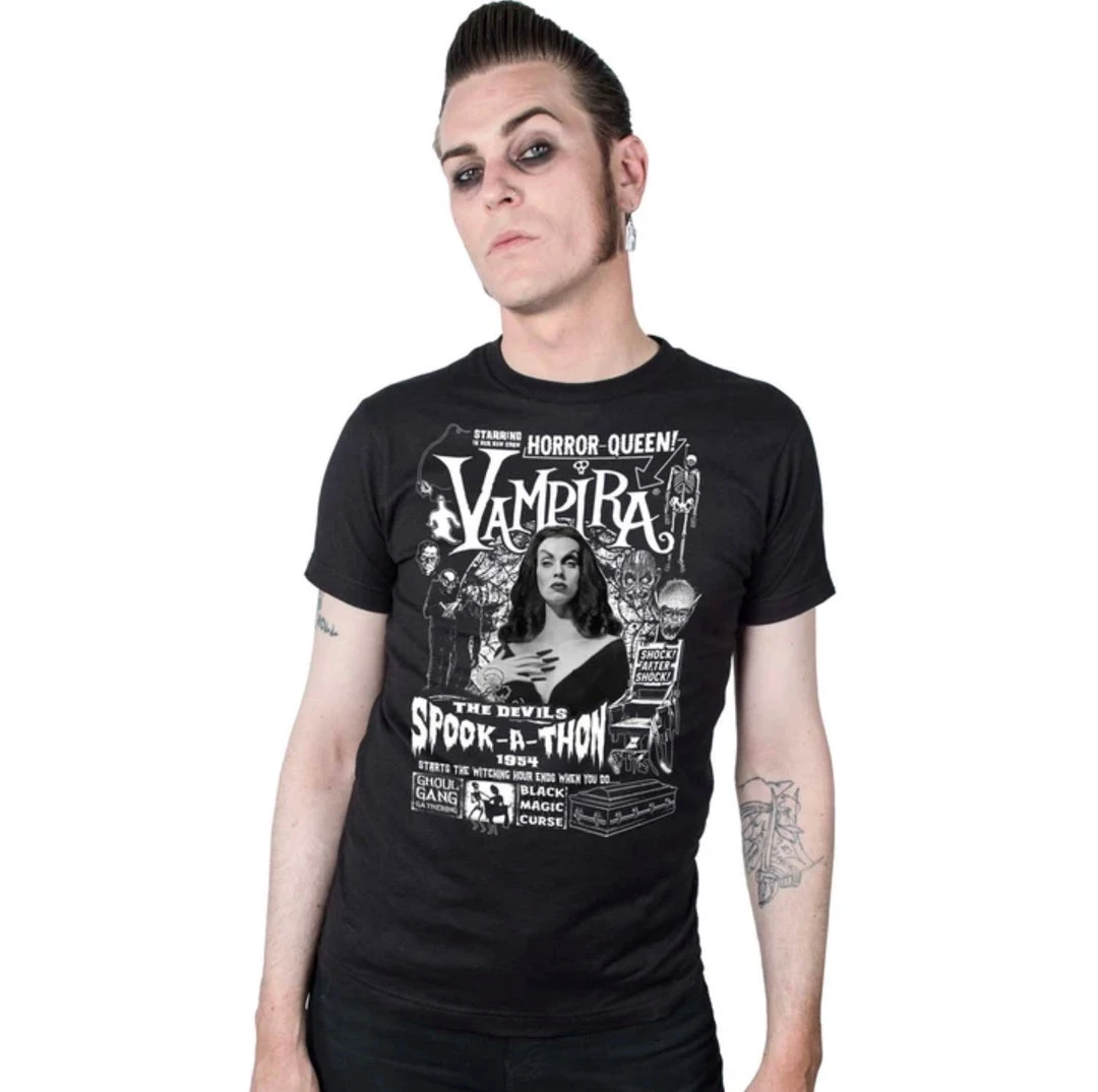 Official Vampira Spook-a-thon t-shirt by Kreepsville, discharge front print on soft feel 100% cotton t-shirt.
