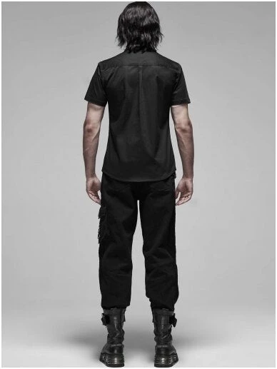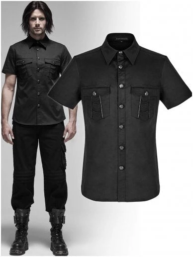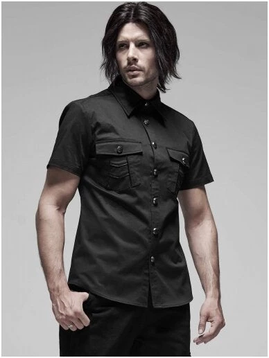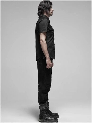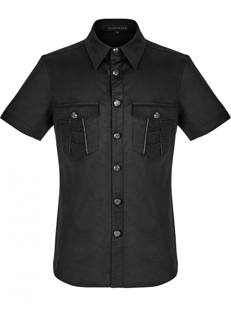 Detroit Shirt by Punk Rave. Gothic Military style men’s black short sleeve shirt with accents on the pockets. Black press-stud buttoned front closure.