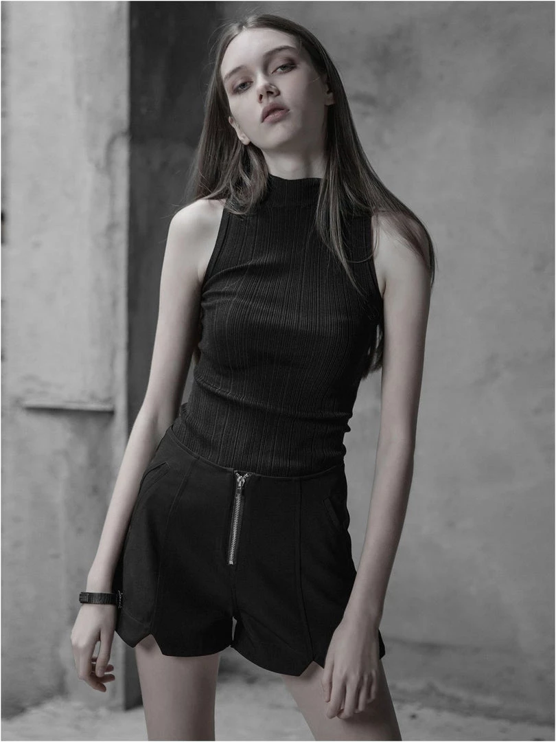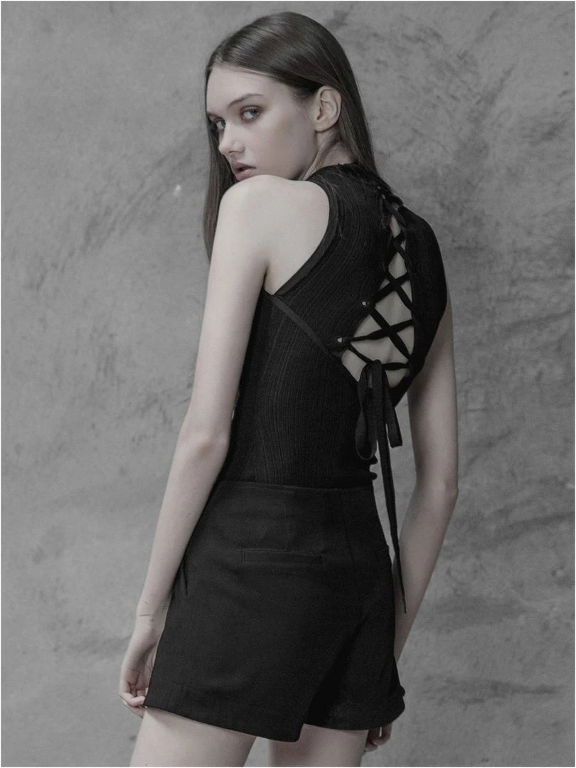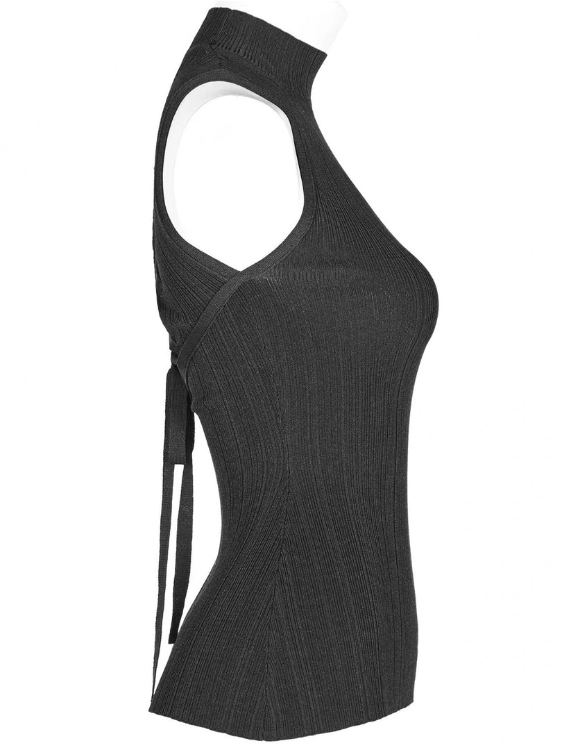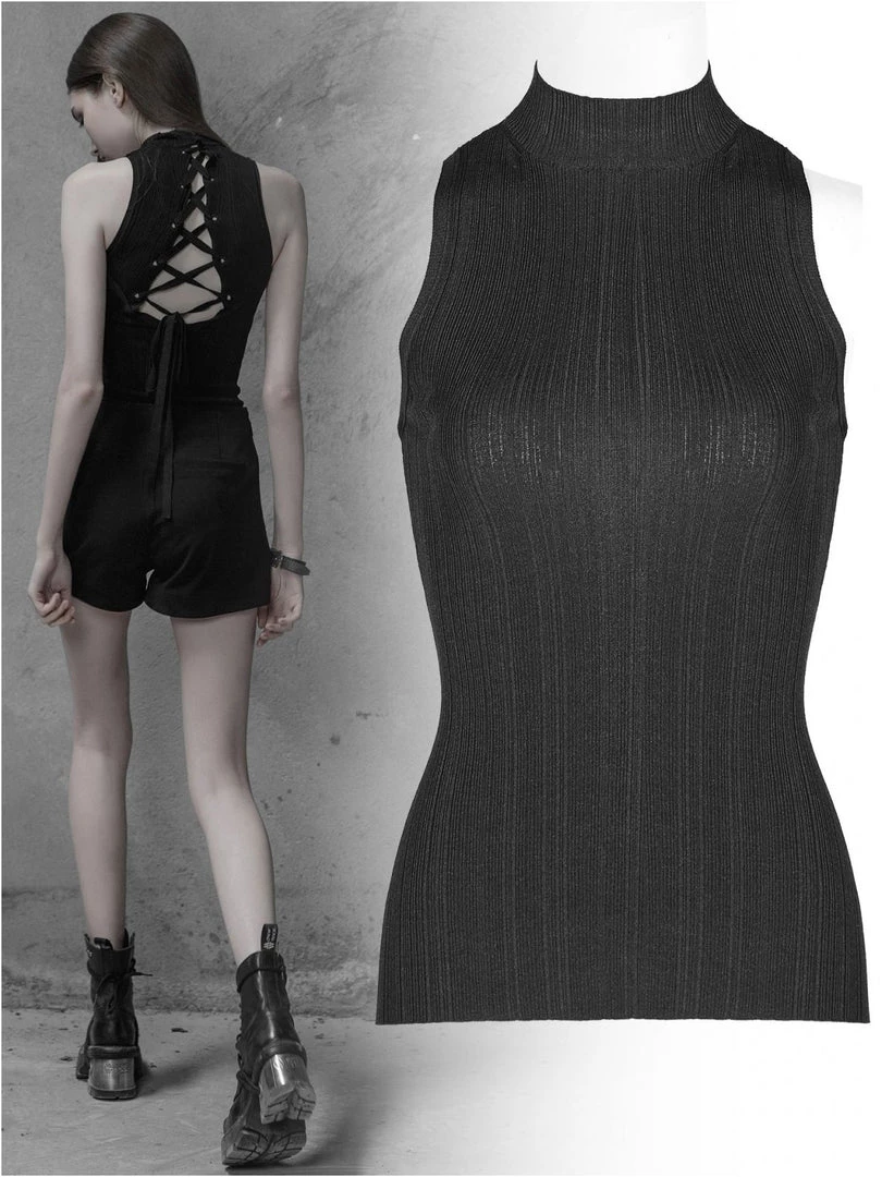 Gothic women’s black sleeveless high neck casual top with laced back.