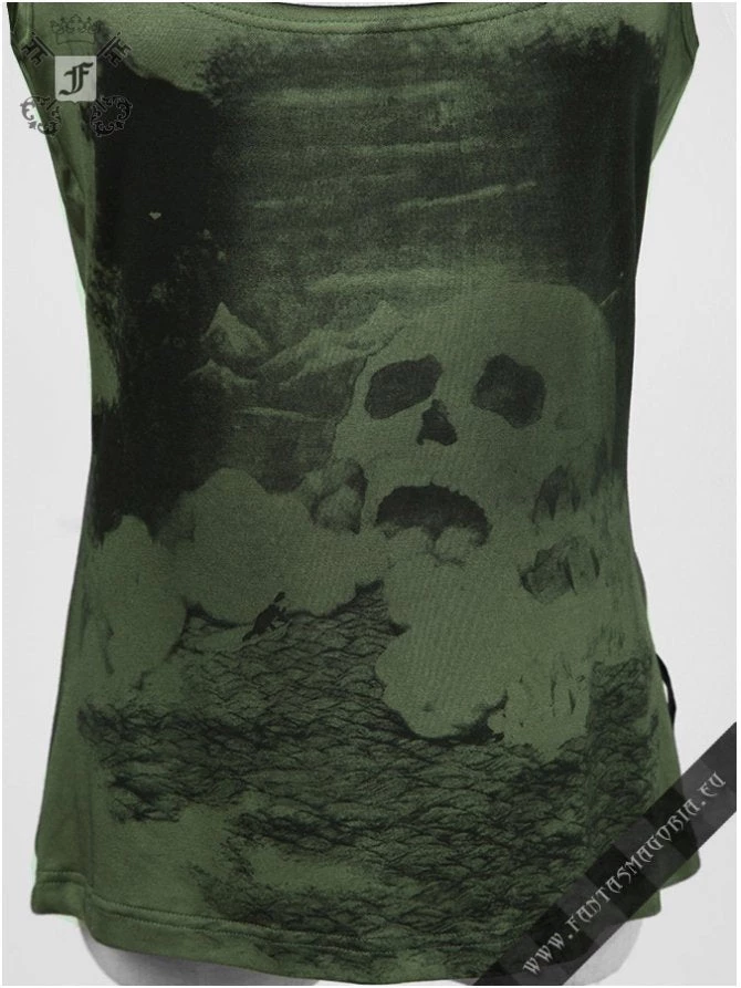 Ombre wash green tank top with a skull print at the front and the skull brooch-patch on the shoulder.
