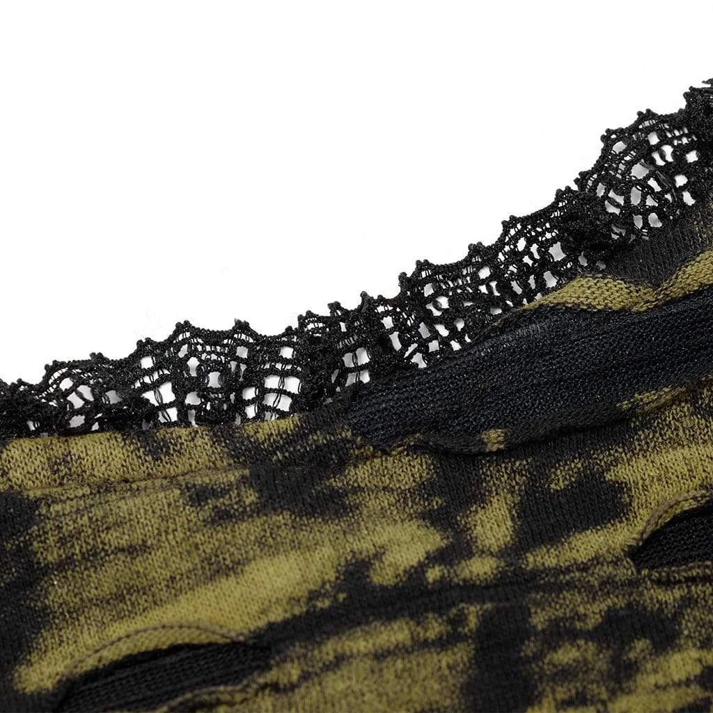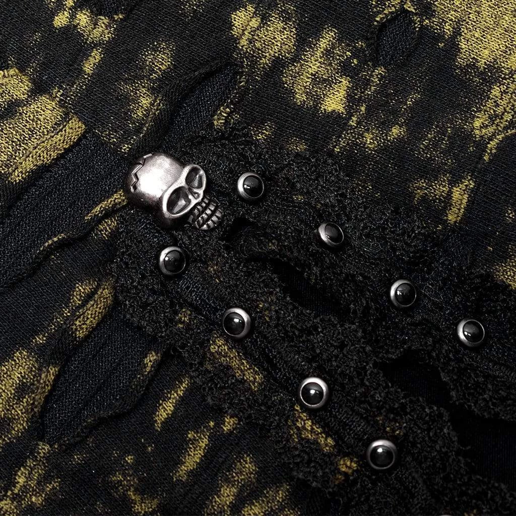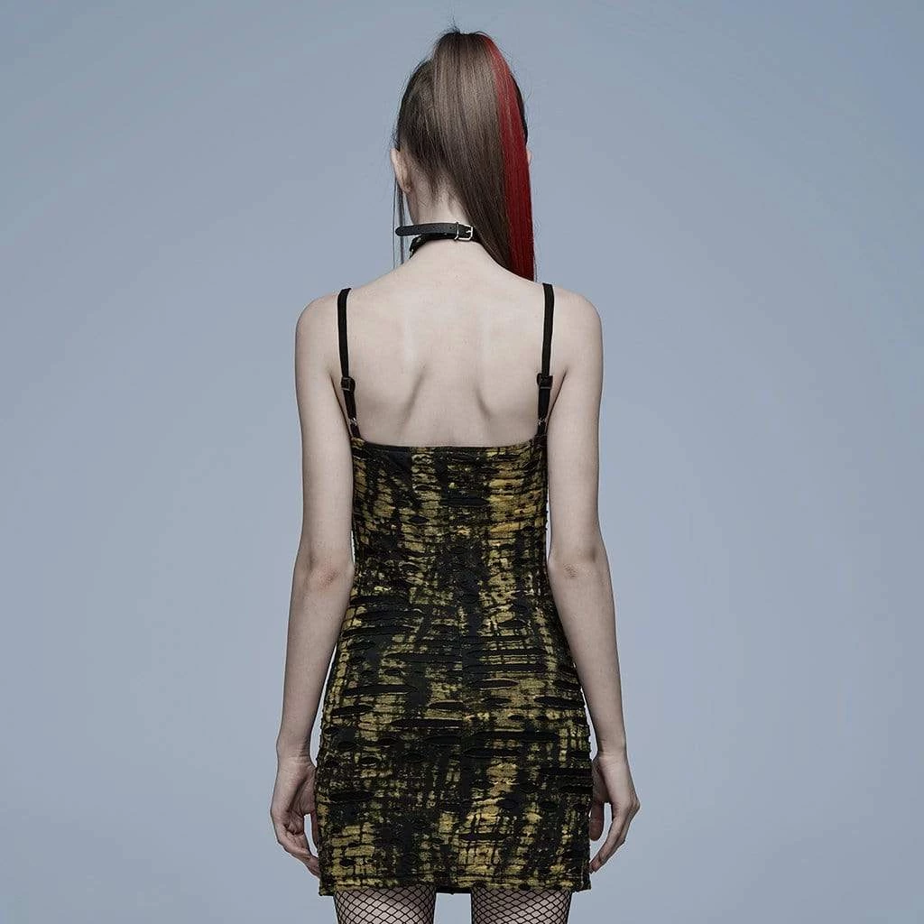 Black and yellow,, layered, tunic-style ripped dress with spaghetti straps and metal skull accents.