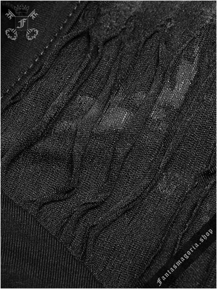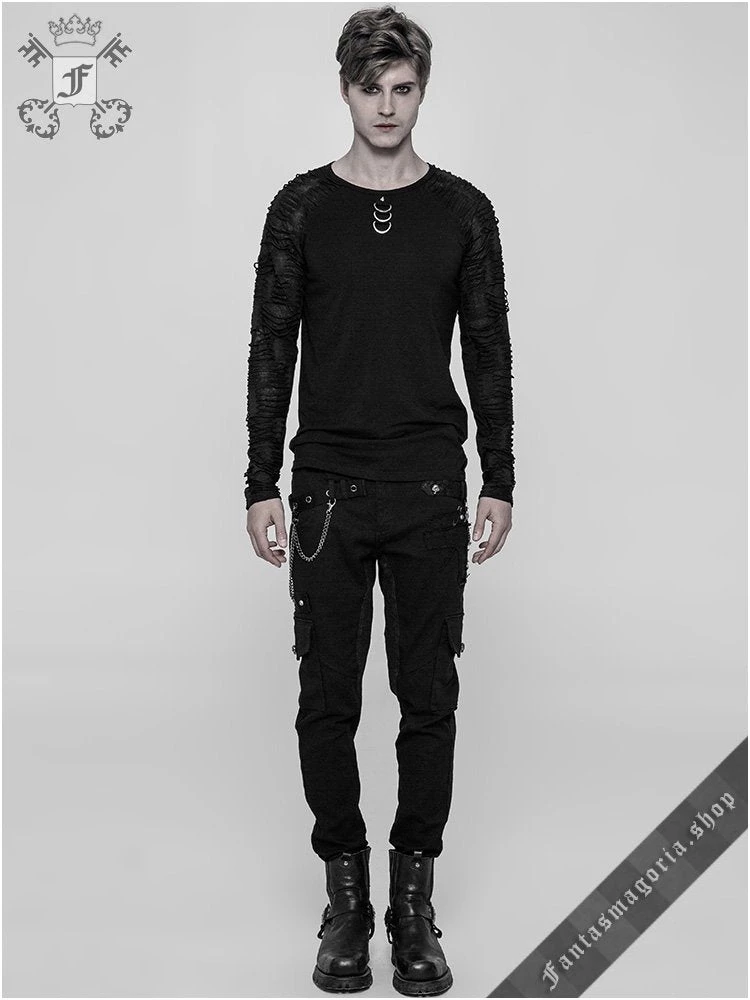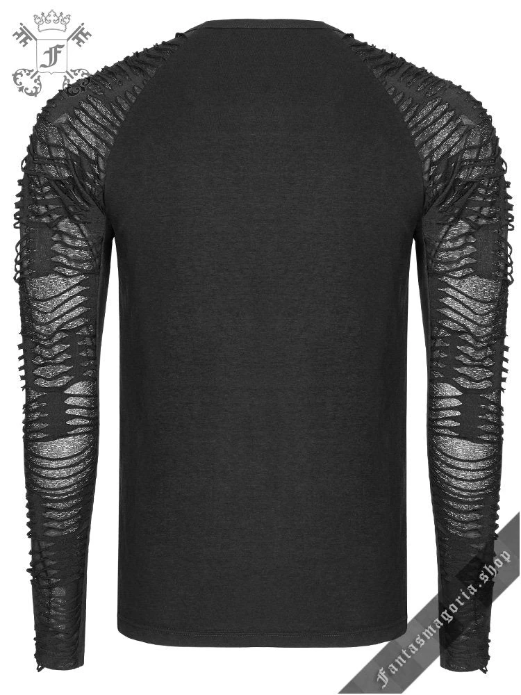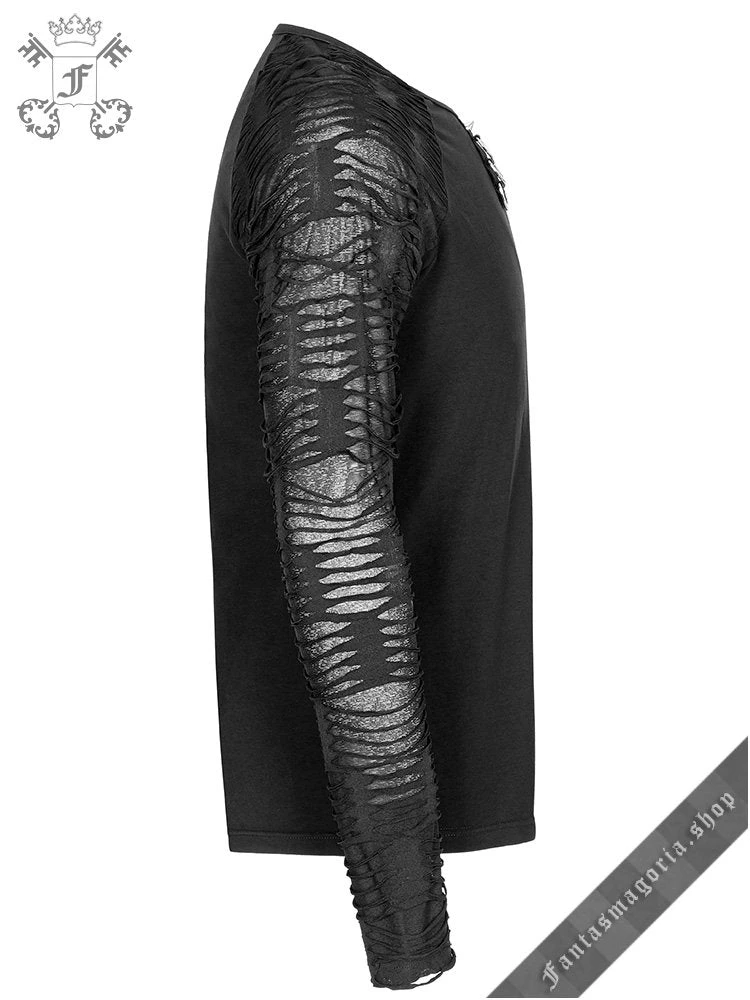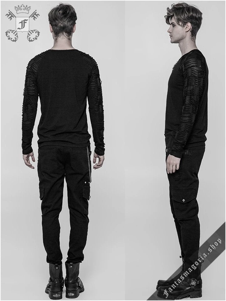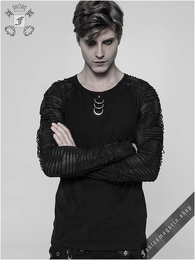 Gothic Industrial men’s black long-sleeved T-shirt with distressed sleeves and D-rings neckline decoration.