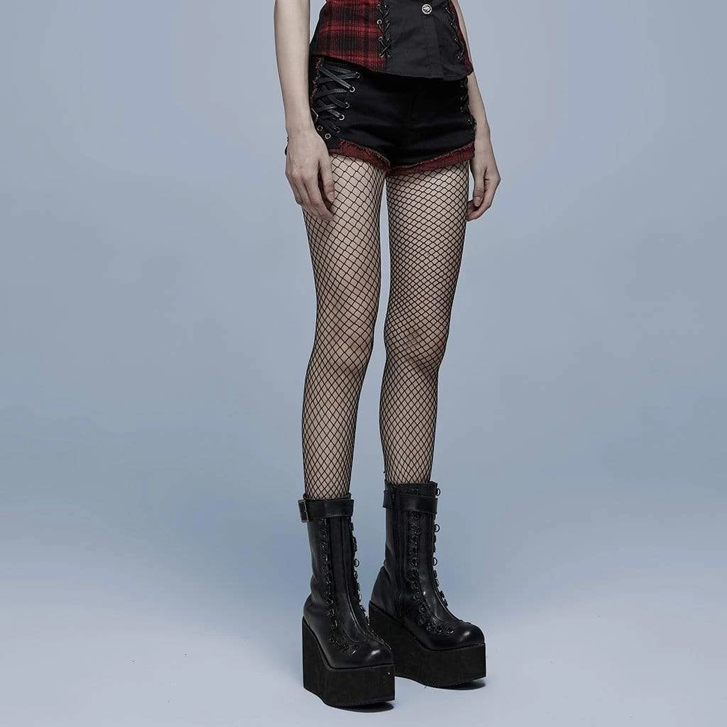 Black and red, stretch denim shorts with straps, buckles and lacing up the sides.