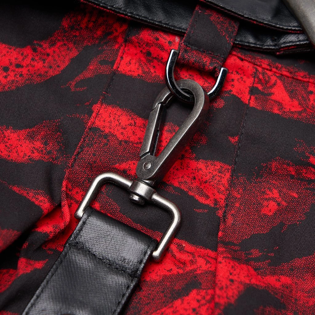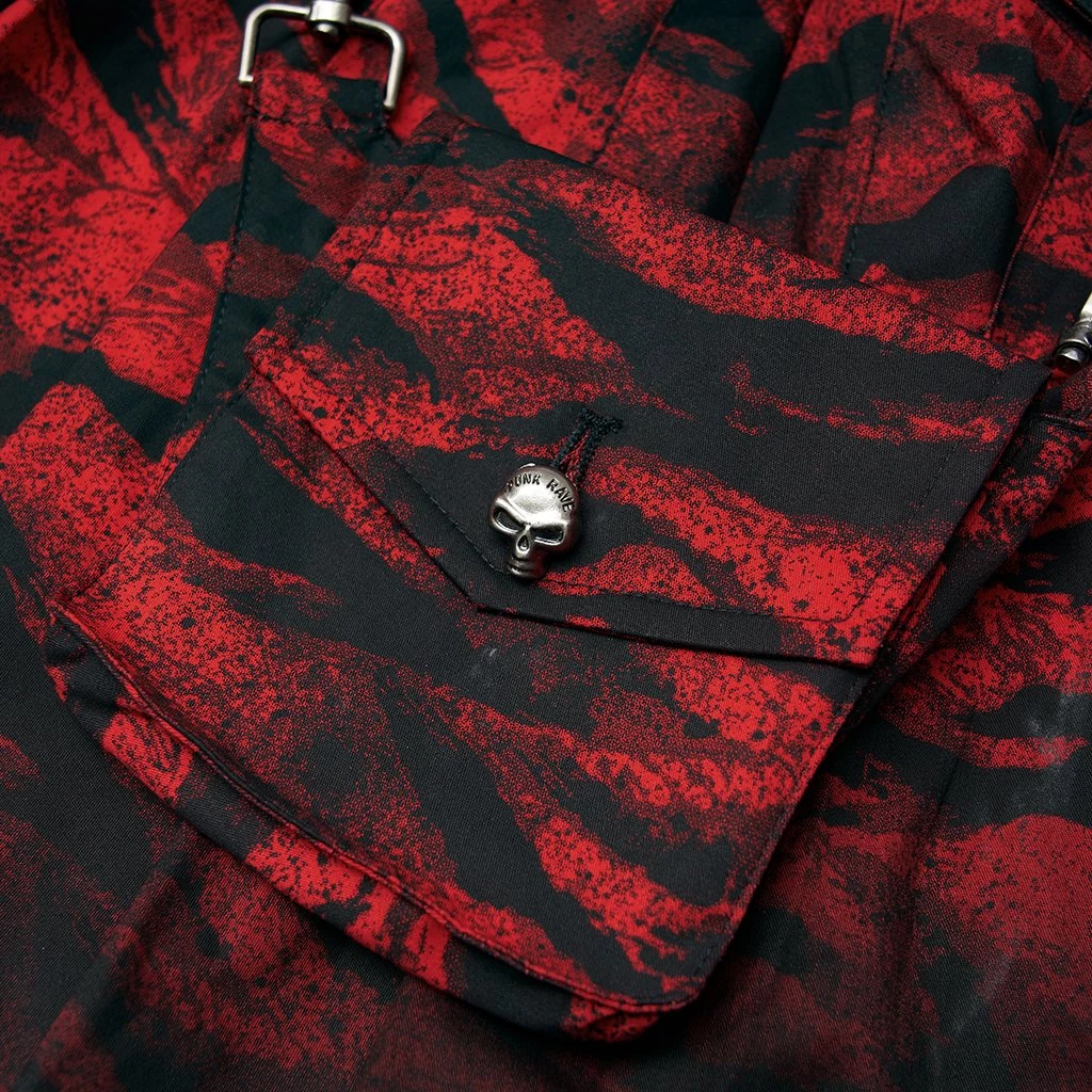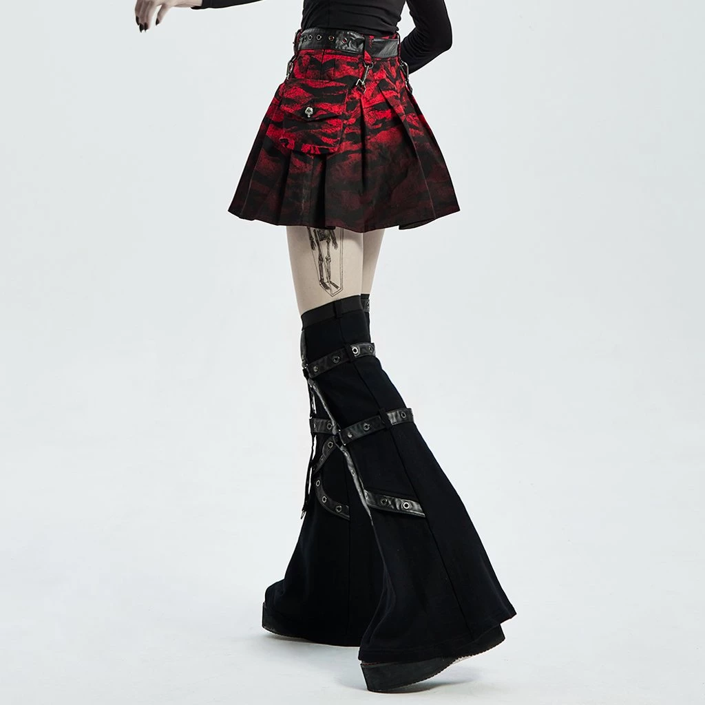 This skirt is made of abstractly printed black and red fabric with metal lobster buckles on both sides of the waist, with PU leather loops and a small, removable waist bag on one side. The waist has an adjustable heavy metal Japanese word buckle. This item is made with a special process of dip dye.