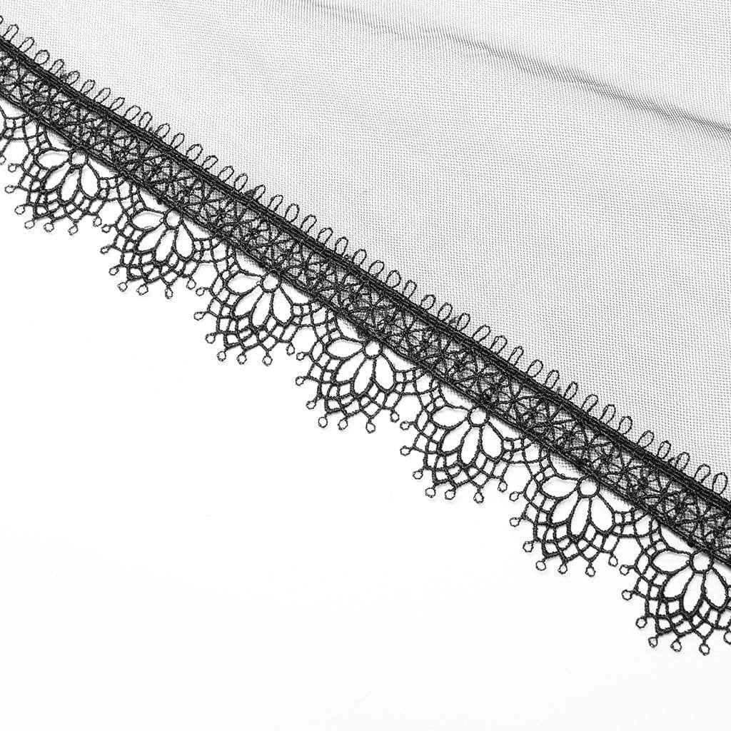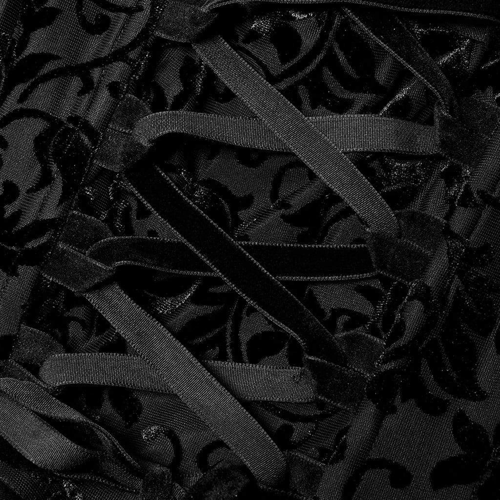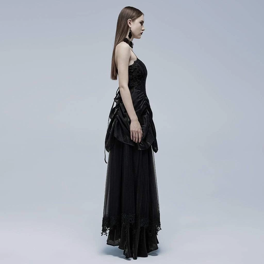 Beautiful, long black dress with flocked damask pattern, layered and draped skirt covered in a black mesh with lace trim. Can be worn with or without the straps.