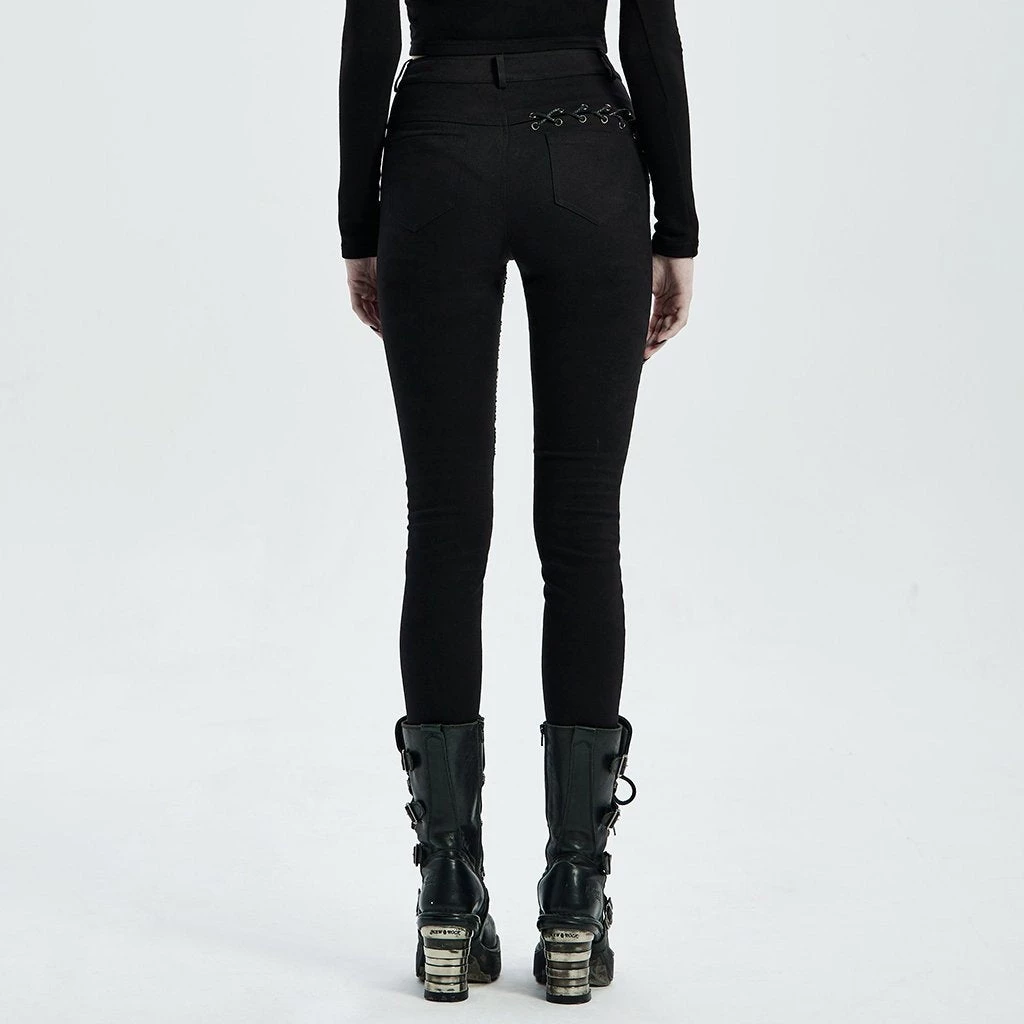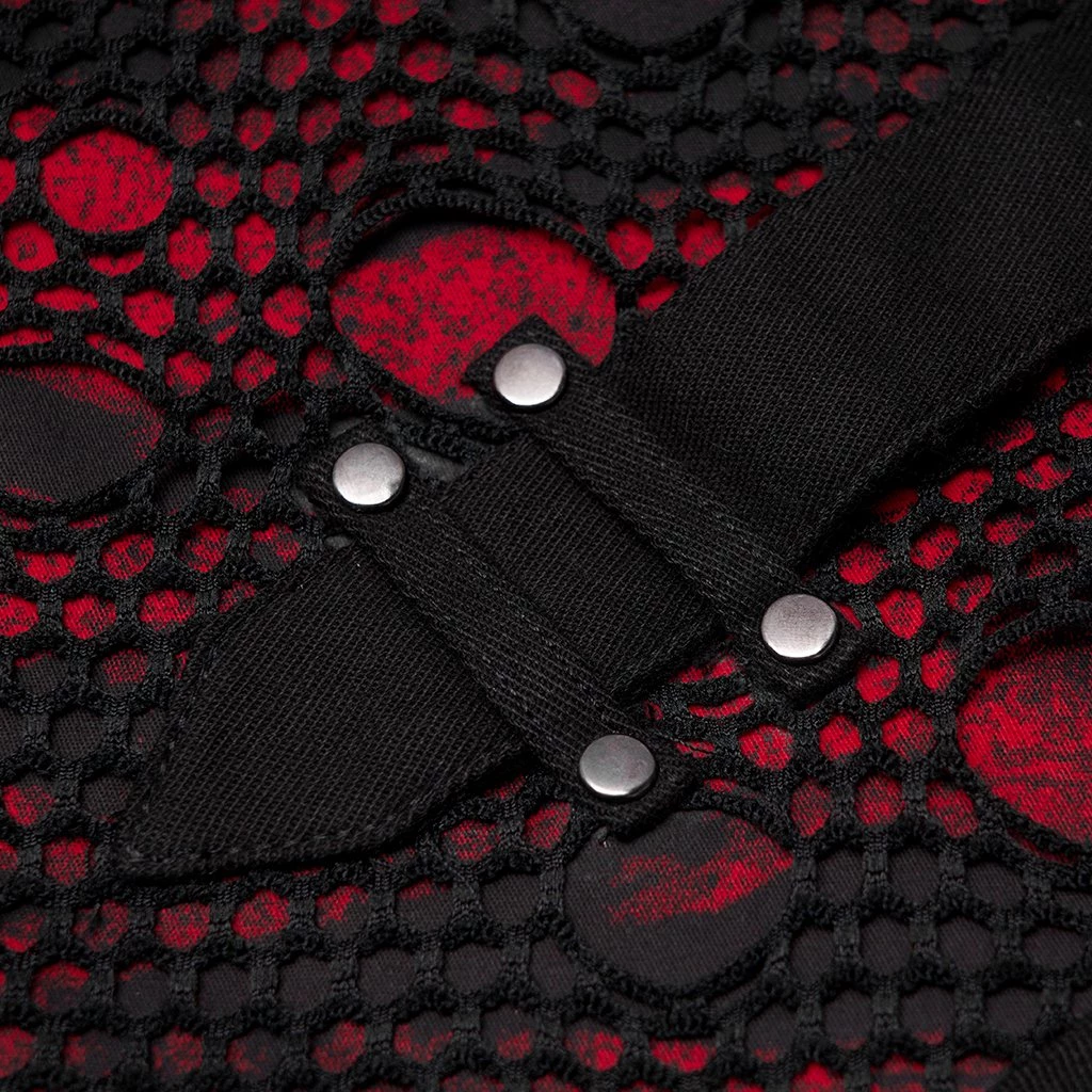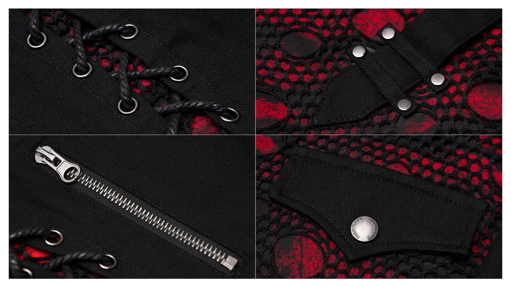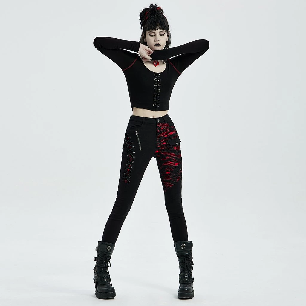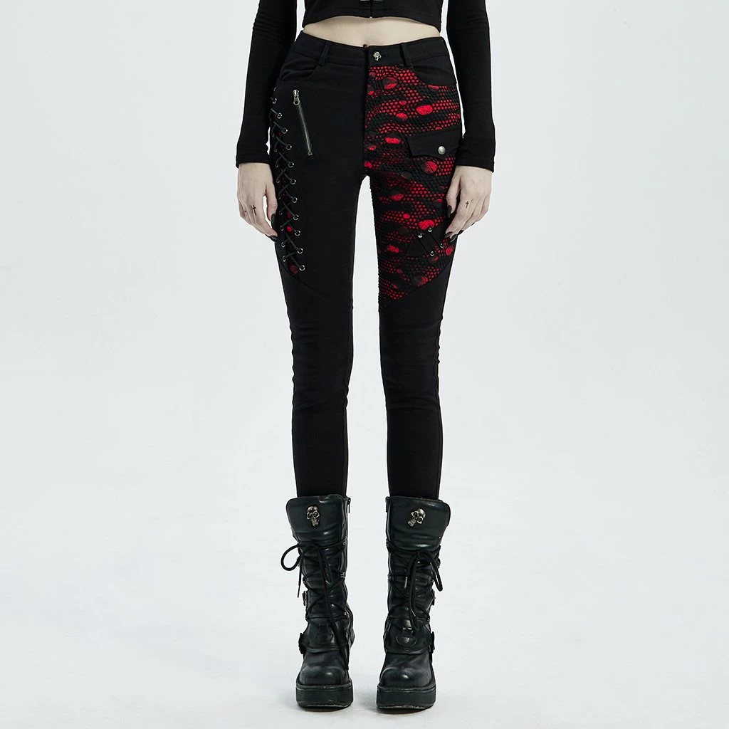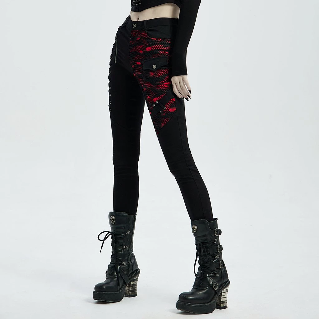 These slim-fit black pants are made of elastic woven fabrics with side stitching, black and red printed fabric with black mesh, rope and zipper accents.