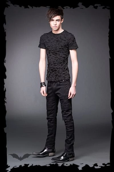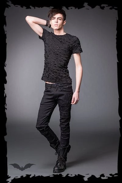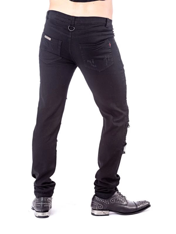 Black Pants with Slits by Queen of Darkness. Slightly stretchy material with 5 pockets, 2 d-rings on the front, 1 d-ring on the back, and shredded throughout and the Queen of Darkness bat on the buttons.