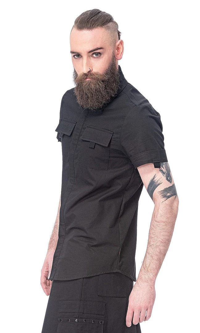 This elegant short-sleeved shirt with 2 breast pockets is perfect for all men who like things simple and elegant. The shirt has a concealed button placket and a collar. Black always fits ! Thanks to the timeless design, you are always elegantly dressed. This men’s shirt is a perfect basic and goes well with pants as well as skirts ! · short sleeve cotton shirt · concealed button placket · elegant shirt collar · two practical breast pockets · timeless design