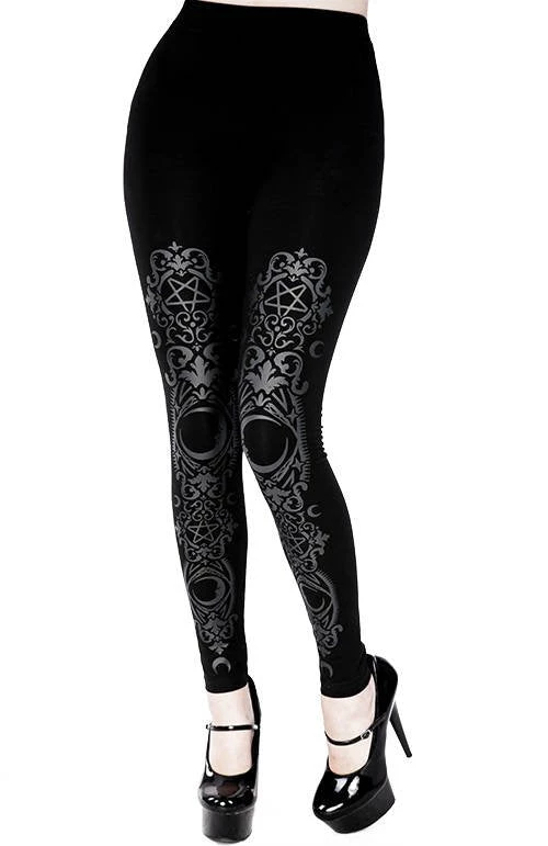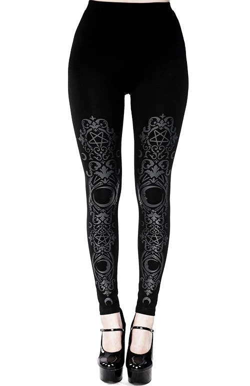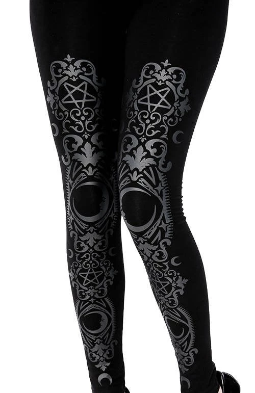 High-waisted black gothic leggings with baroque print.