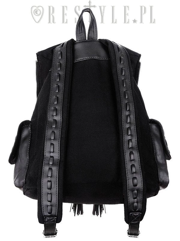 Backpack is entirely decorated with faux leather string and metal zippers used as trimmings.