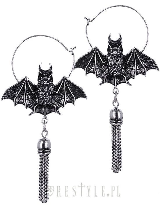 Earrings with oriental bats placed on the hoop with tassels. Jewellery is in antique silver color with grunge texture.