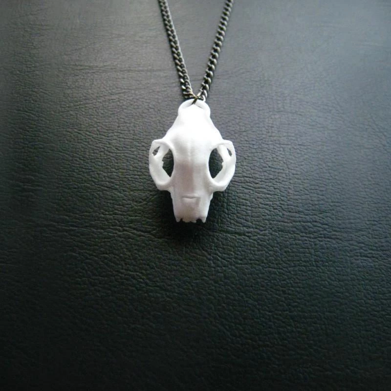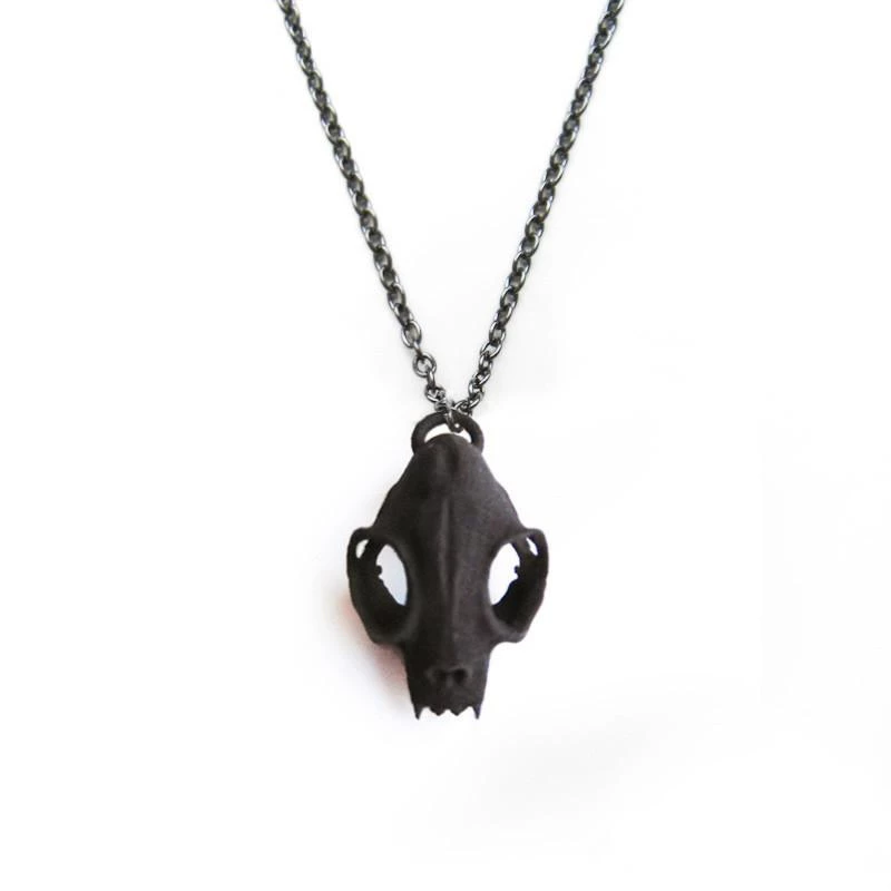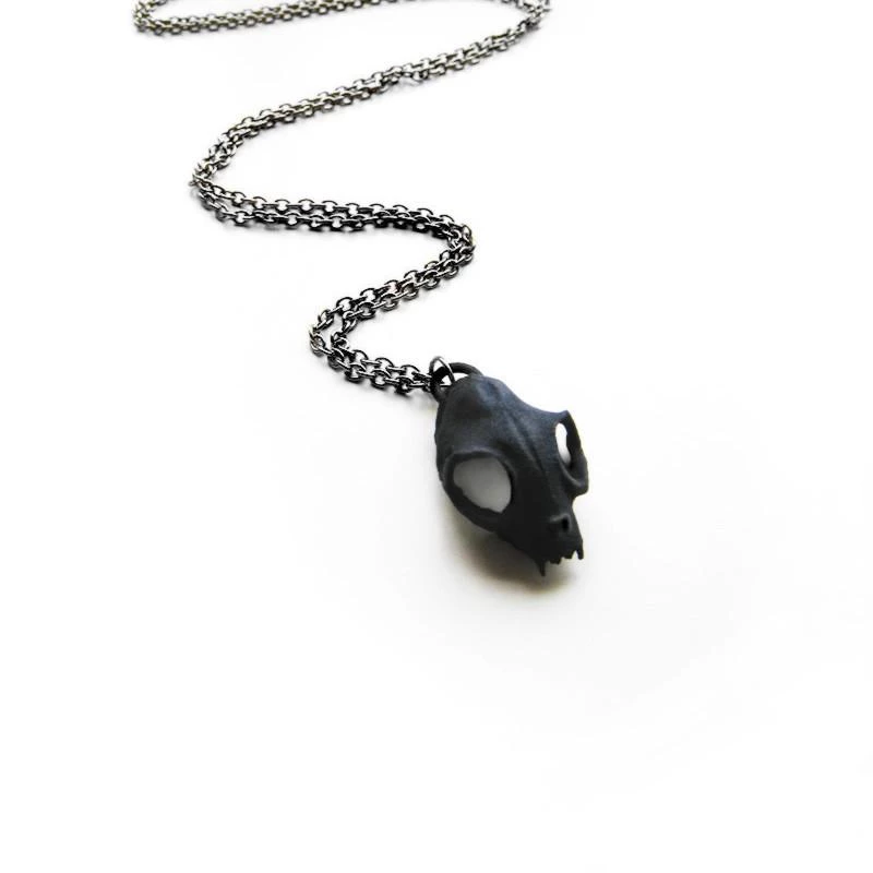 A black or white cat skull necklace on a gunmetal chain to adorn your neck.