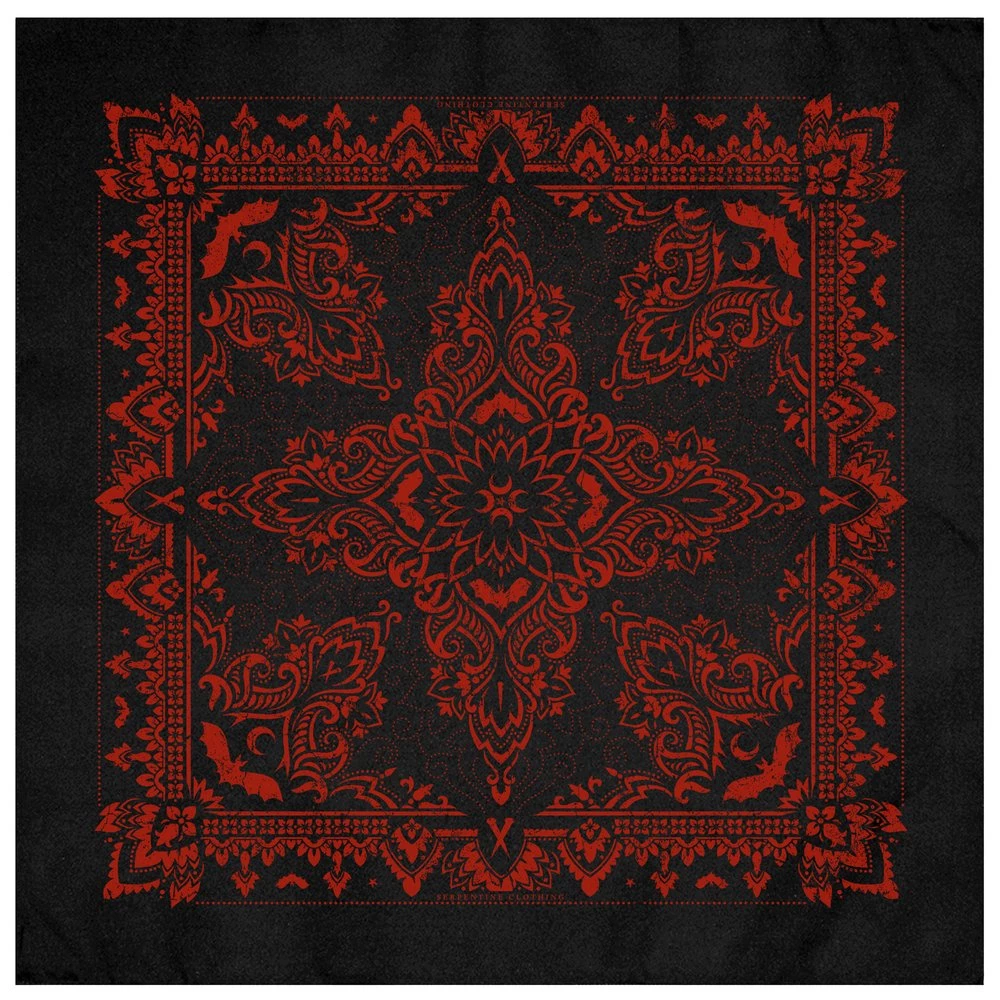 Bloodletting Bandana is Blood Red on Black and Features Bats in A Vintage-Style design. Designed diagonally so once it’s folded and tied it will display at it’s very best. 100% Cotton fabric blend makes it easy to wrap and tie on the go! One size fits all and measures approximately 21.5″ x 21.5″.