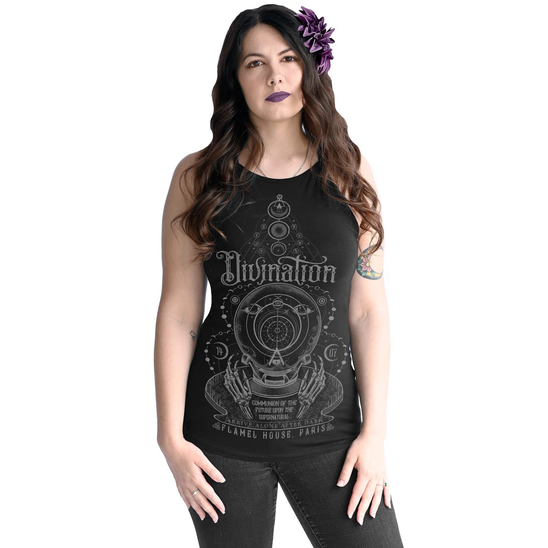 Divination Women’s Halter Top is Grey and dark Metallic Silver on Black. Features: A High Square Halter Neck, Racerback, Ribbed Cotton Jersey Knit.