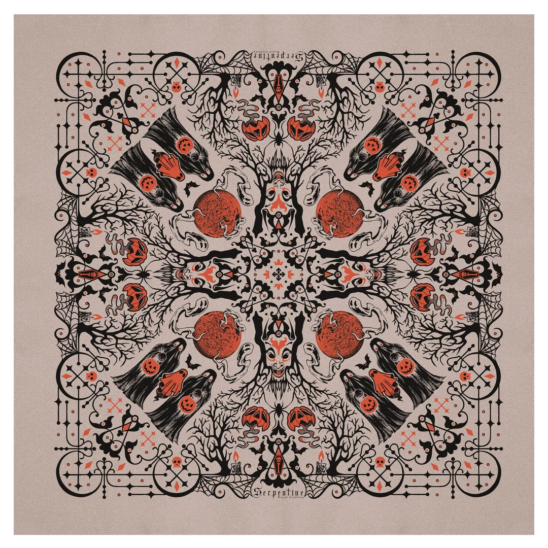 Tricks & Treats Bandana is Vintage Rust Orange and Black on a Beige bandana. Designed diagonally so once it’s folded and tied it will display at it’s very best.