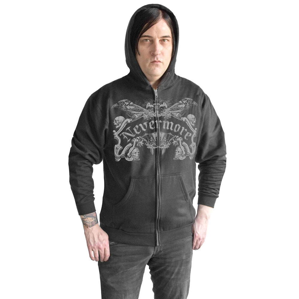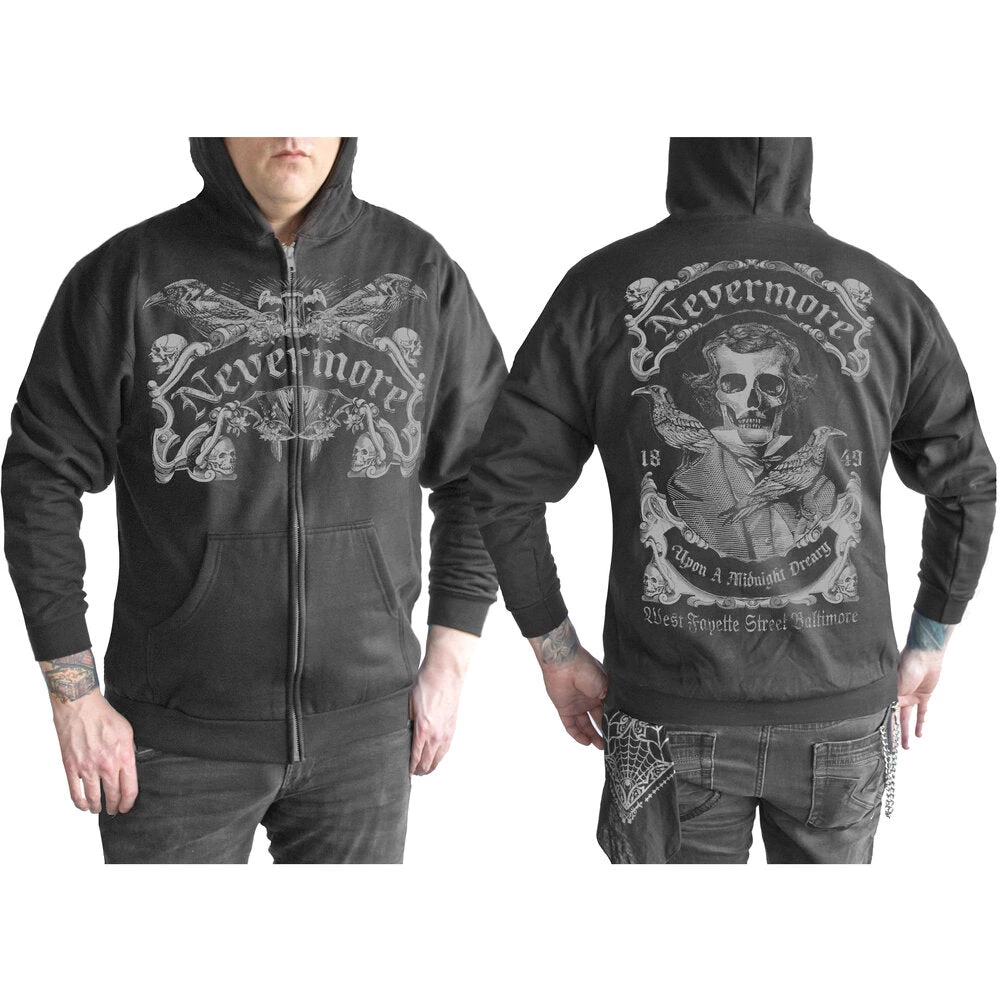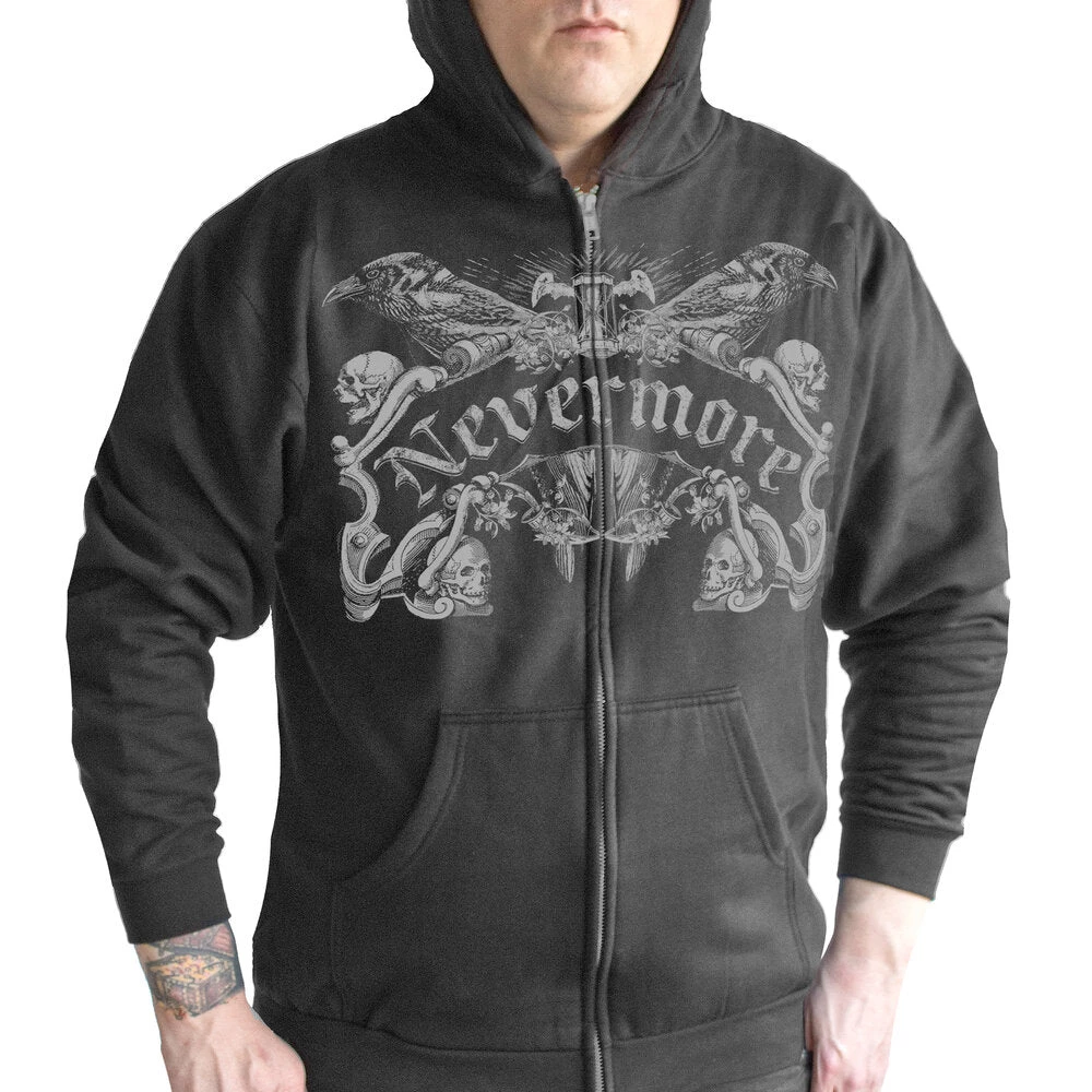 Nevermore Men’s Hoodie is a Pull Zip Hoodie is Grey on Black. Comfortable lightweight Fleece and a Contemporary fit. 100% Cotton and pre-shrunk.