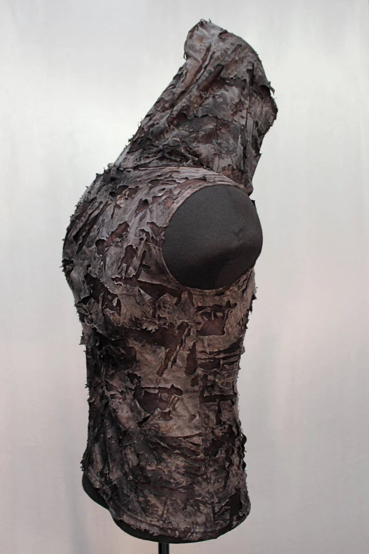 A post-apocalyptical classic t-shirt! A fitted hoody t-shirt made in comfortable double-layered stretch fabric. The top layer, a grey/black color is shredded giving this fabric a classic zombie look. This style is sleeveless with a large, stretchy hood. Comes in sizes small-XXL.