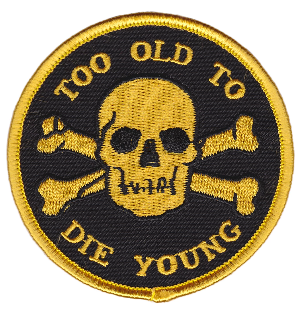 A wise man once said: “I’m too old for this shit!” and correct, he was. So if you’re a little more ‘in bed by 8’ than ‘up all night’, then you’re probably Too Old to Die Young. Proclaim it proudly with our this iron-on patch, featuring our skull & bones with your new motto in black & gold.