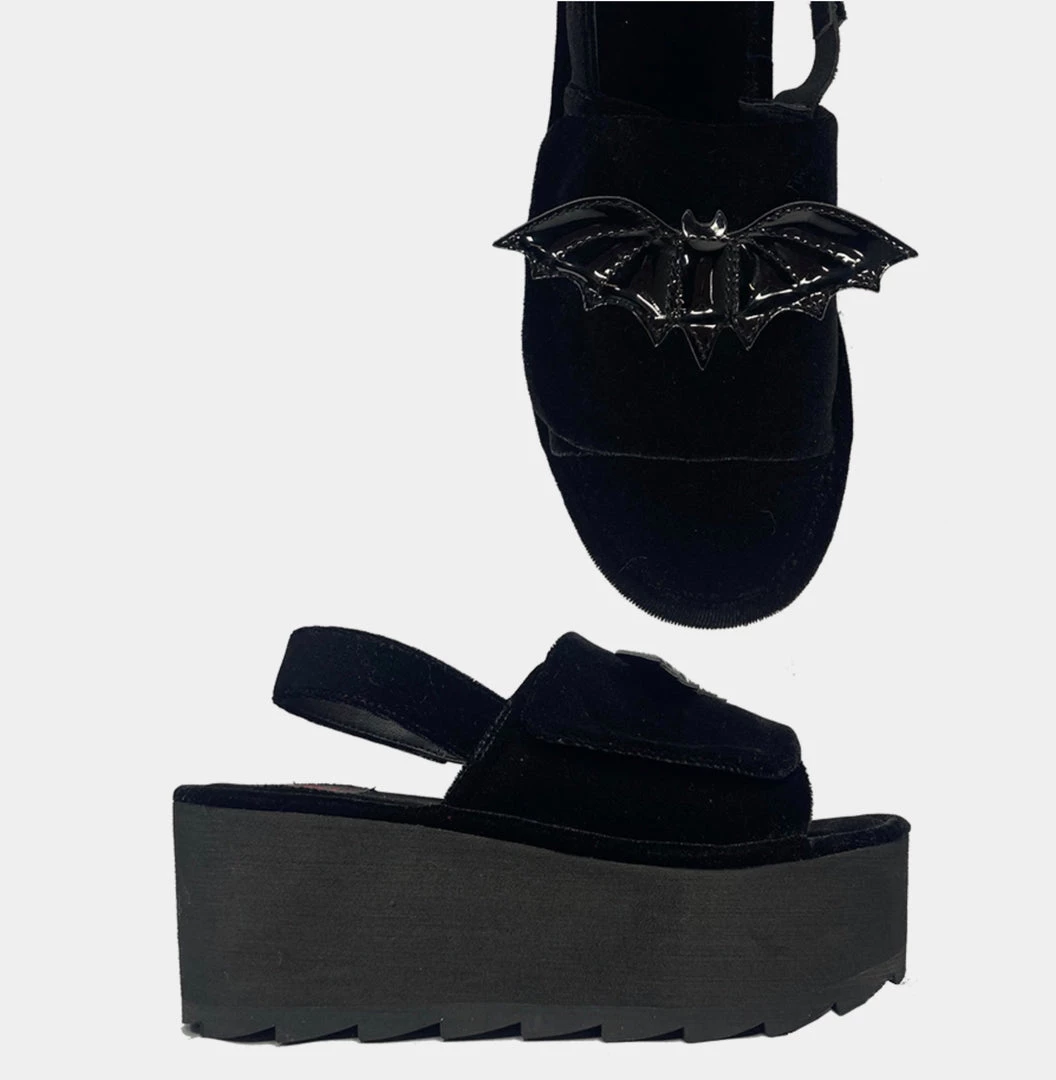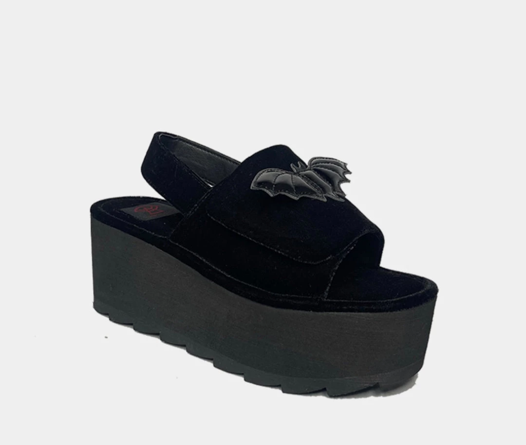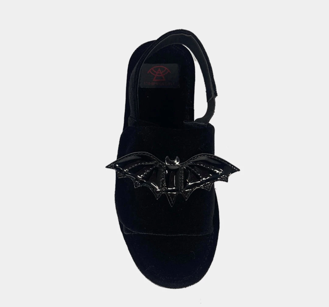 The Lilly Bat Black Velvet platform sandal by Strange Cvlt.