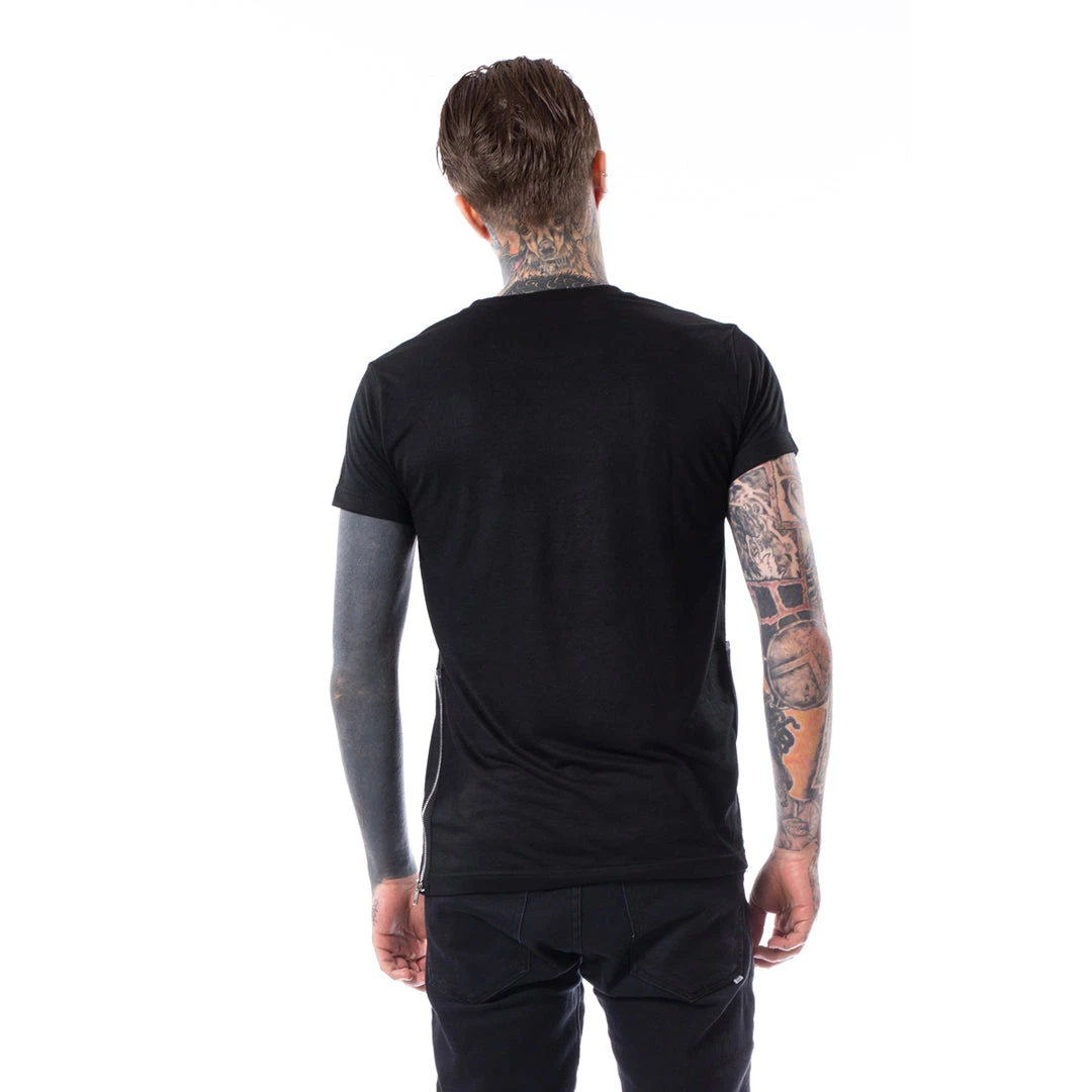 Black, slightly stretchy t-shirt with zipper accents on the shoulders and sides.