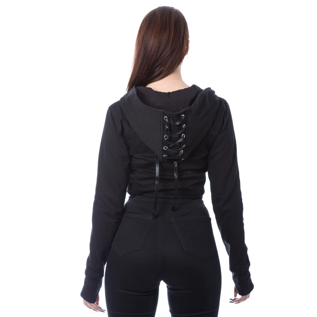 Women’s hooded crop-top jacket with corset lacing details on the front and hood.