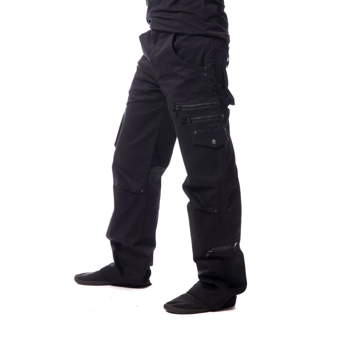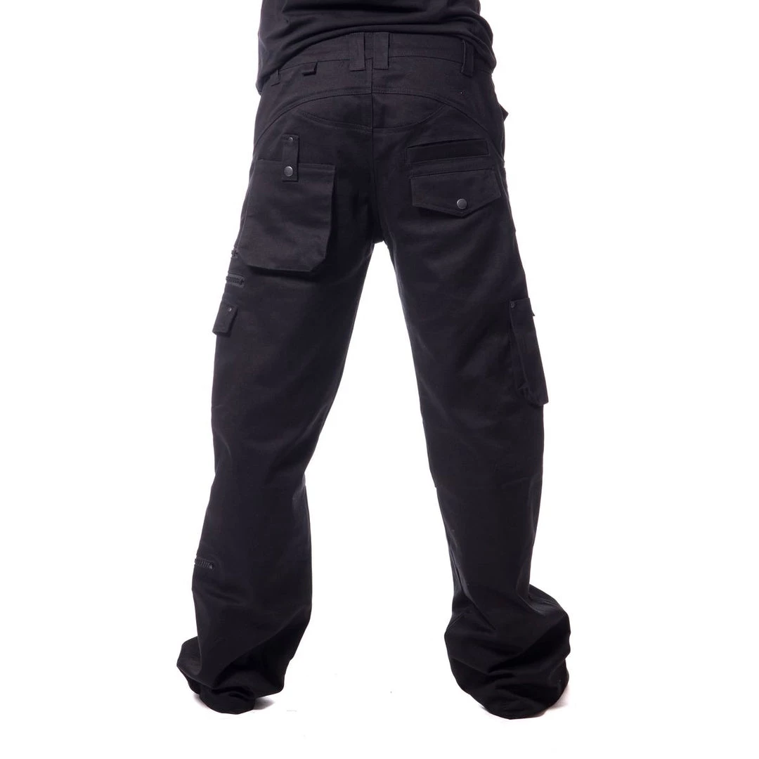 Black, loose fit & slightly stretchy with 9 pockets. Note: Pants are tall and meant to be worn bunched up at the bottom.