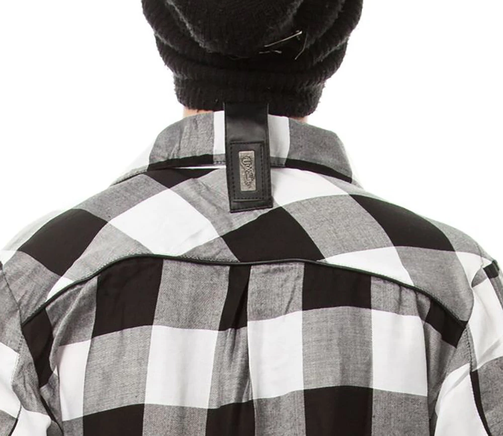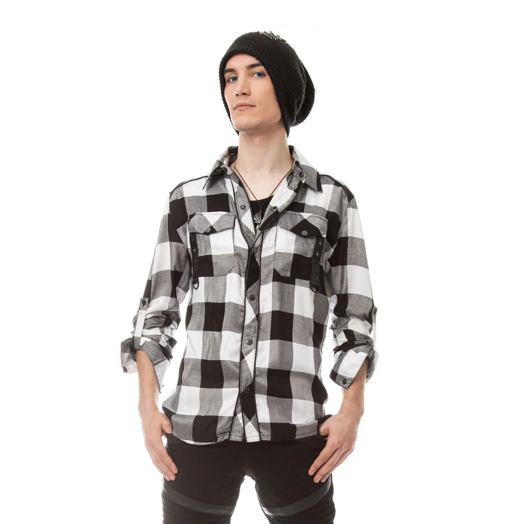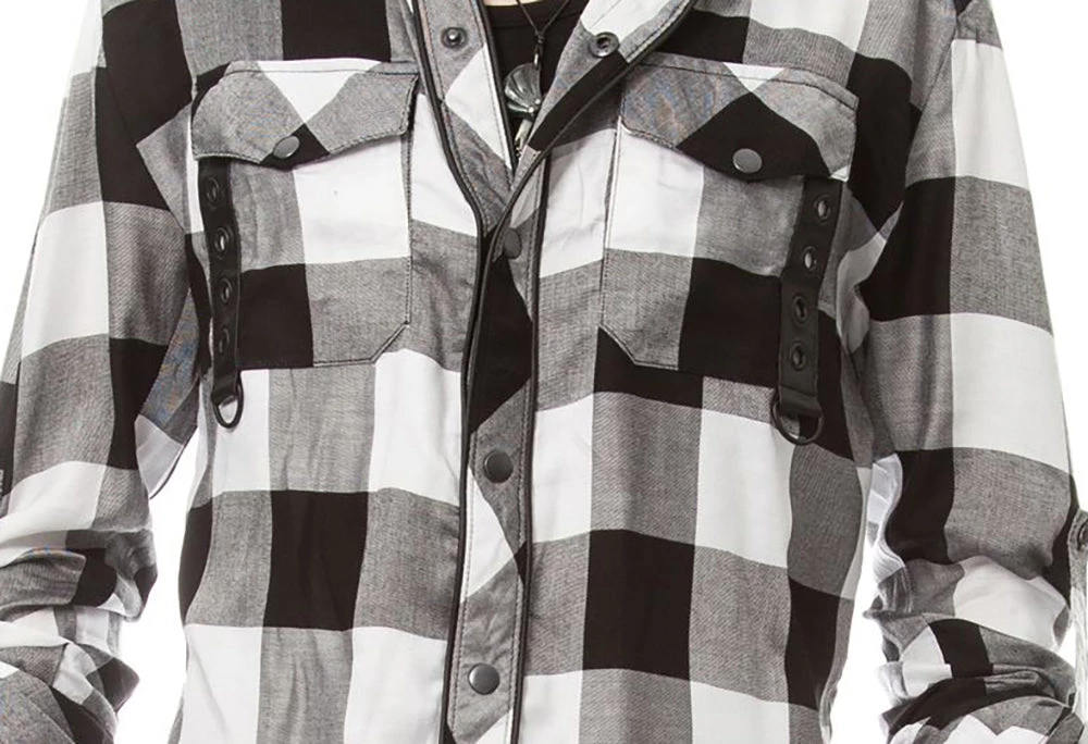 Black & white checked, lightweight shirt with black faux leather straps & d-rings on the front pockets, faux leather strap on the back collar.