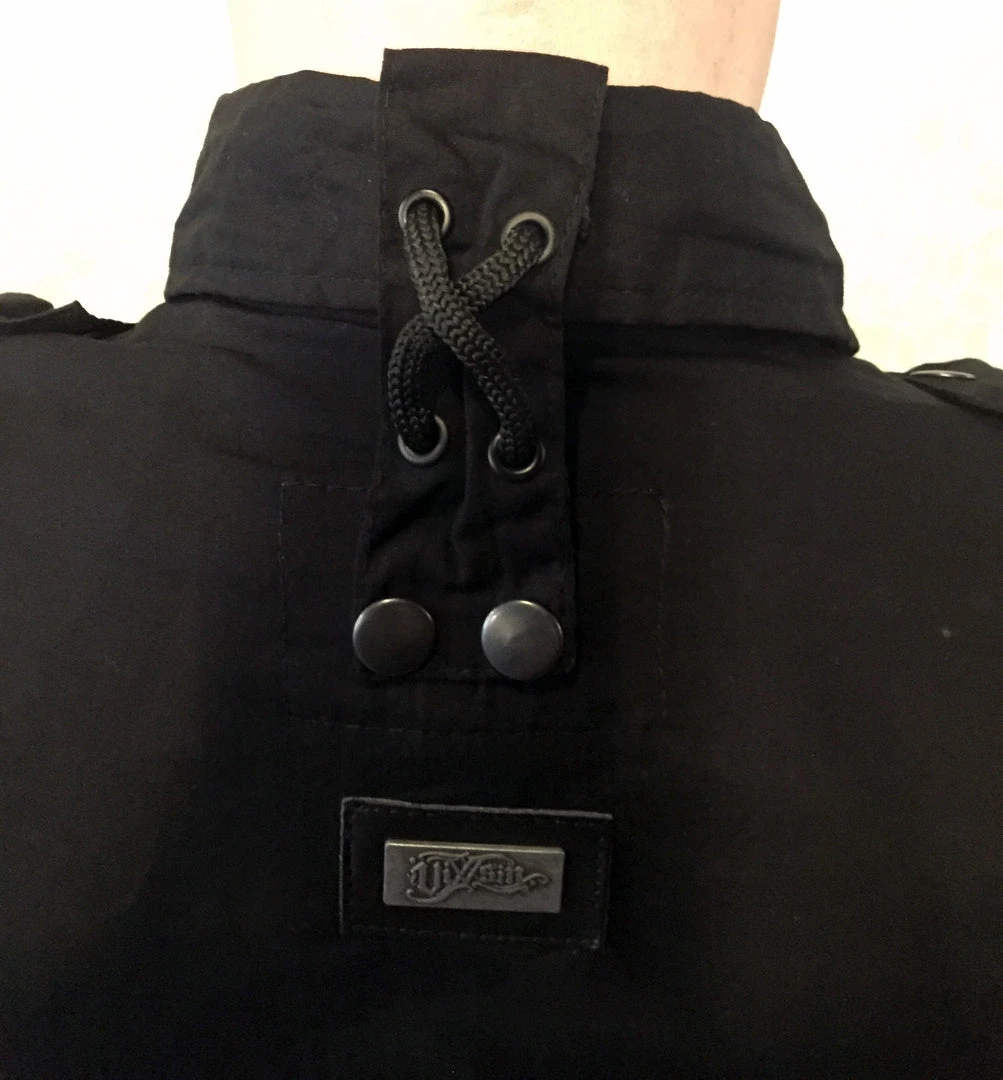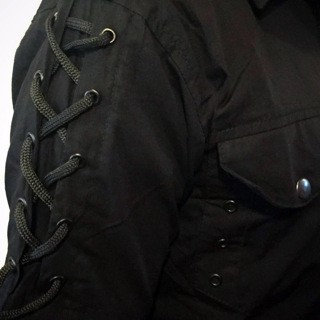 Fitted black shirt with black snap buttons, side pockets, black laces up the sleeves and collar, and black eyelets on the chest pockets.