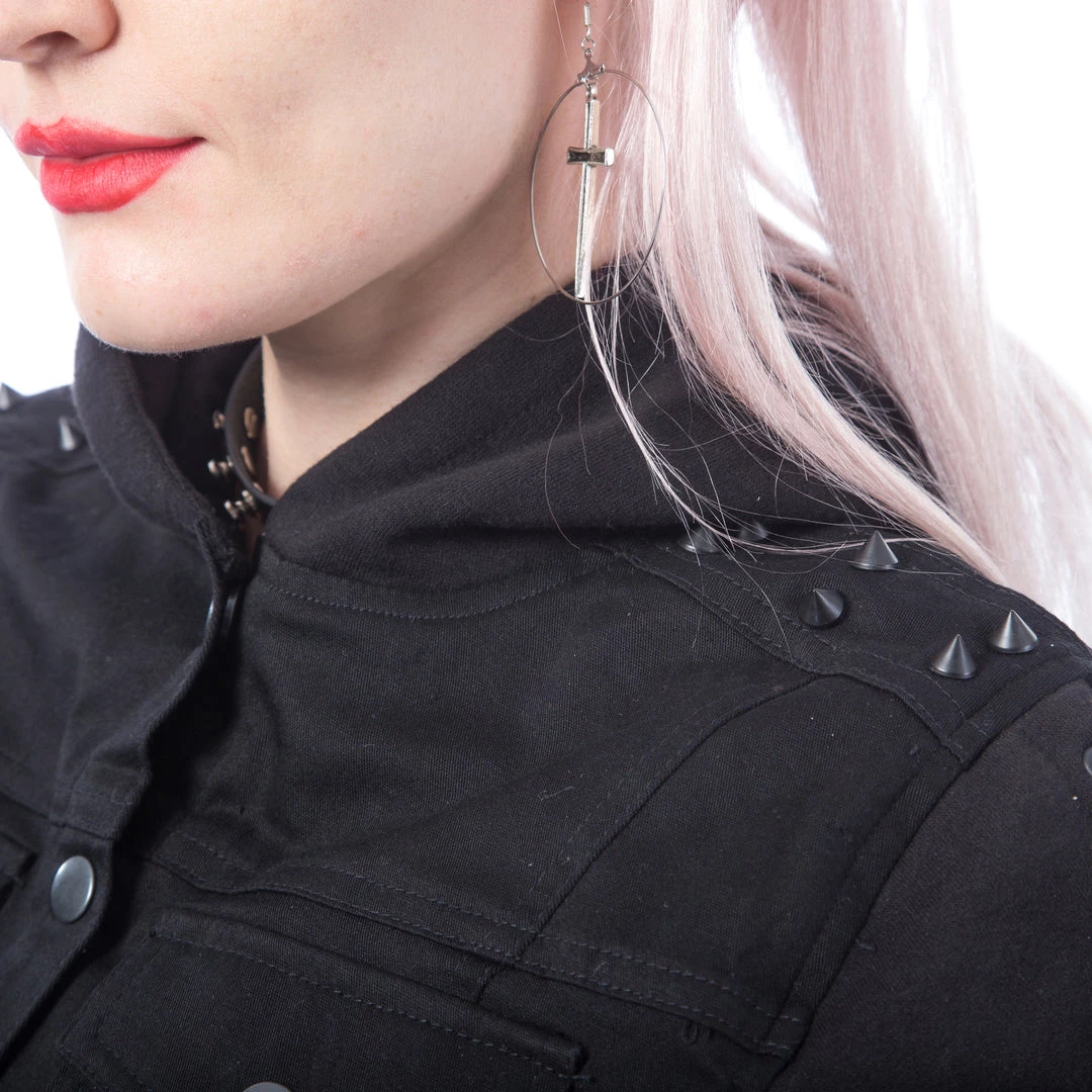 Black hooded jacket with black spike studs and lace-up arms and sides. The arms and hood are a soft cotton sweatshirt material